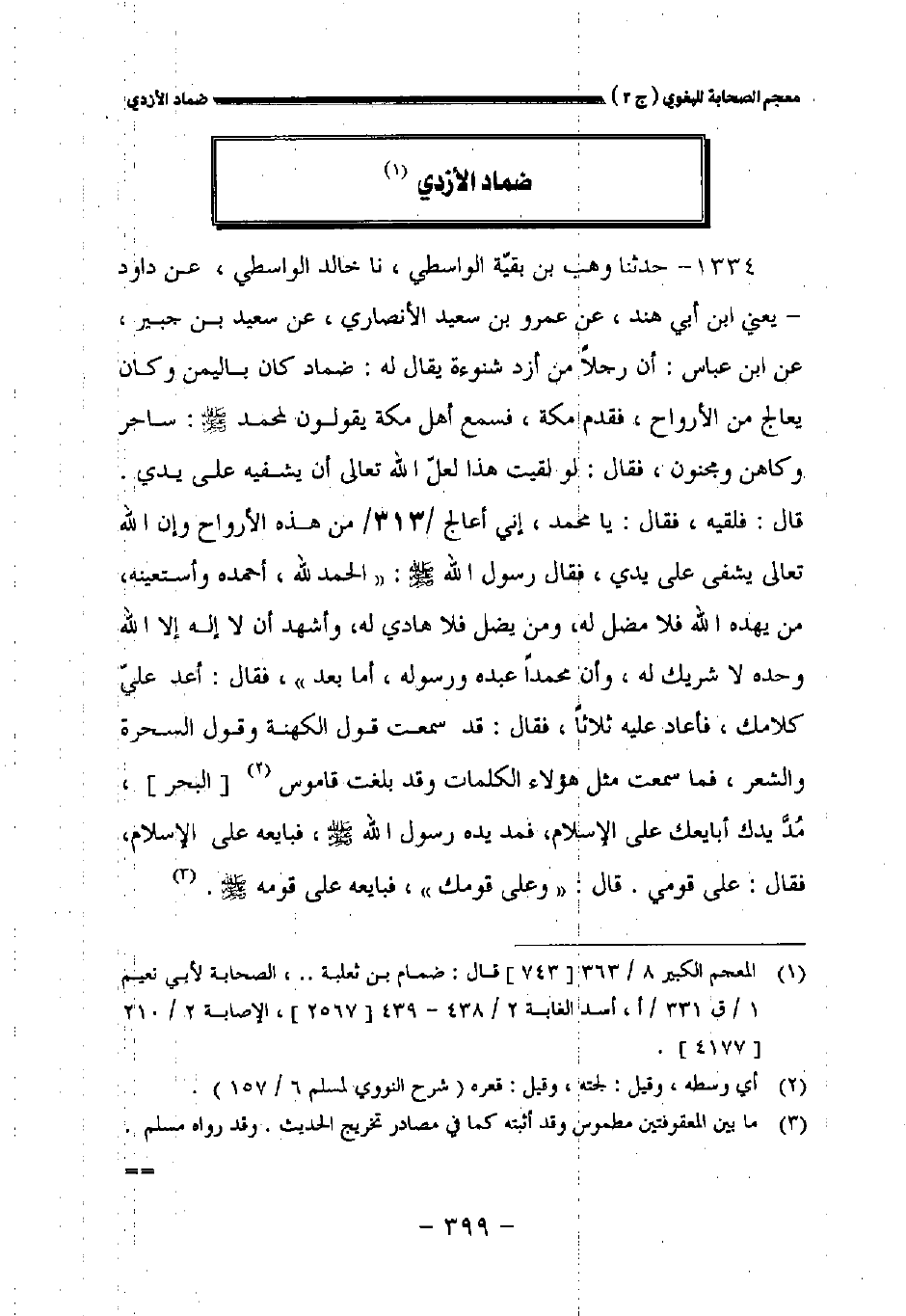 ١٣٣٤ - حدثنا وهب بن بقية الواسطي نا خالد الواسطي عن داود يعني ابن أبي هند عن عمرو بن سعيد الأنصاري عن سعيد بن جبير عن ابن عباس: أن رجلا من أزد شنوءة يقال له: ضماد كان باليمن وكان يعالج من الأرواح فقدم مكة فسمع أهل مكة يقولون لمحمد صلى الله عليه وسلم: ساحر وكاهن ومجنون فقال: لو لقيت هذا لعل الله تعالى أن يشفيه على يدي.