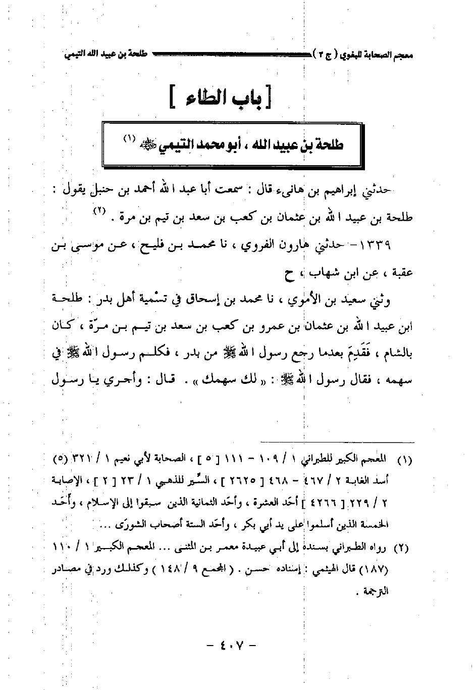 وحدثني سعيد بن الأموي نا محمد بن إسحاق في تسمية أهل بدر: طلحة بن عبيد الله بن عثمان بن عمرو بن كعب بن سعد بن تيم بن مرة كان بالشام فقدم بعدما رجع رسول الله صلى الله عليه وسلم من بدر فكلم رسول الله صلى الله عليه وسلم في سهمه فقال رسول الله صلى الله عليه وسلم: " لك سهمك ". قال: وأجري يا رسول
