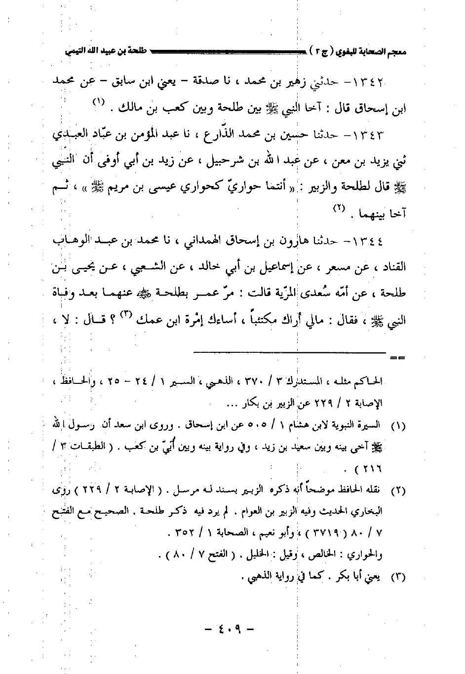 ١٣٤٢ - حدثني زهير بن محمد نا صدقة - يعني ابن سابق - عن محمد بن إسحاق قال: آخى النبي صلى الله عليه وسلم بين طلحة وبين كعب بن مالك.