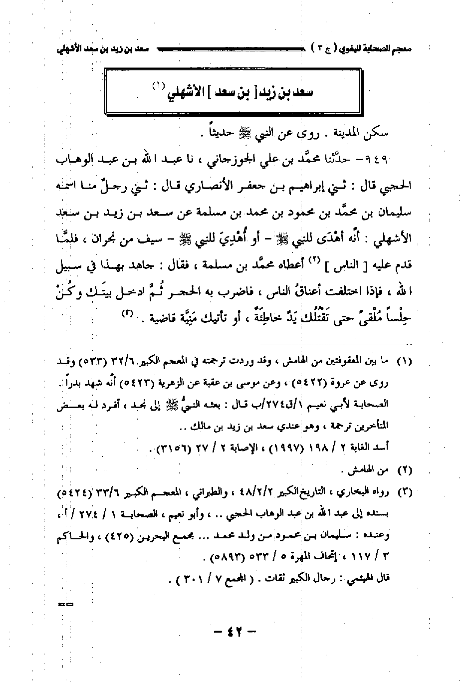 ٩٤٩ - حدثنا محمد بن علي الجوزجاني نا عبد الله بن عبد الوهاب الحجبي قال: حدثني إبراهيم بن جهفر الأنصاري قال: حدثني رجل منا اسمه سليمان بن محمد بن محمود بن محمد بن مسلمة عن سعد بن زيد بن سعد الأشهلي: أنه أهدى للنبي صلى الله عليه وسلم أو أُهدى للنبي صلى الله عليه وسلم سيف من نجران فلما قدم عليه [الناس] أعطاه محمد بن مسلمة فقال: جاهد بهذا في سبيل الله فإذا اختلفت أعناق الناس فاضرب به الحجر ثم ادخل بيتك وكن حلسا ملقى حتى تقتلك يد خاطئة، أو تأتيك منية قاضية.