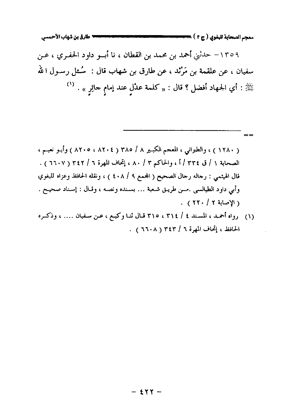 ١٣٥٩ - حدثني أحمد بن محمد بن القطان نا أبو داود الحفري عن سفيان عن علقمة بن مرثد عن طارق بن شهاب قال: سئل رسول الله صلى الله عليه وسلم: أي الجهاد أفضل؟ قال: " كلمة عدل عند إمام جائر.