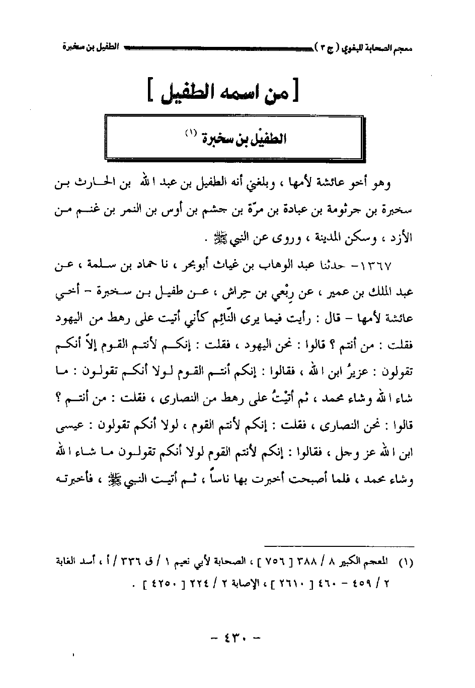١٣٦٧ - حدثنا عبد الوهاب بن غياث أبو بحر نا حماد بن سلمة عن عبد الملك بن عمير عن ربعي بن حراش عن طفيل بن سخبرة أخي عائشة لأمها - قال: رأيت فيما يرى النائم كأني أتيت على رهط من اليهود فقلت: من أنتم؟ قالوا: نحن اليهود، فقلت: إنكم لأنتم القوم إلا أنكم تقولون: عزير ابن الله، فقالوا: إنكم أنتم القوم لولا أنكم تقولون: ما شاء الله وشاء محمد ثم أتيت على رهط من النصارى فقلت: من أنتم؟ قالوا: نحن النصارى فقلت: إنكم لأنتم القوم لولا أنكم تقولون: عيسى ابن الله عز وجل، فقالوا: إنكم لأنتم القوم لولا أنكم تقولون ما شاء الله وشاء محمد فلما أصبحت أخبرت بها ناسا ثم أتيت النبي صلى الله عليه وسلم فأخبرته