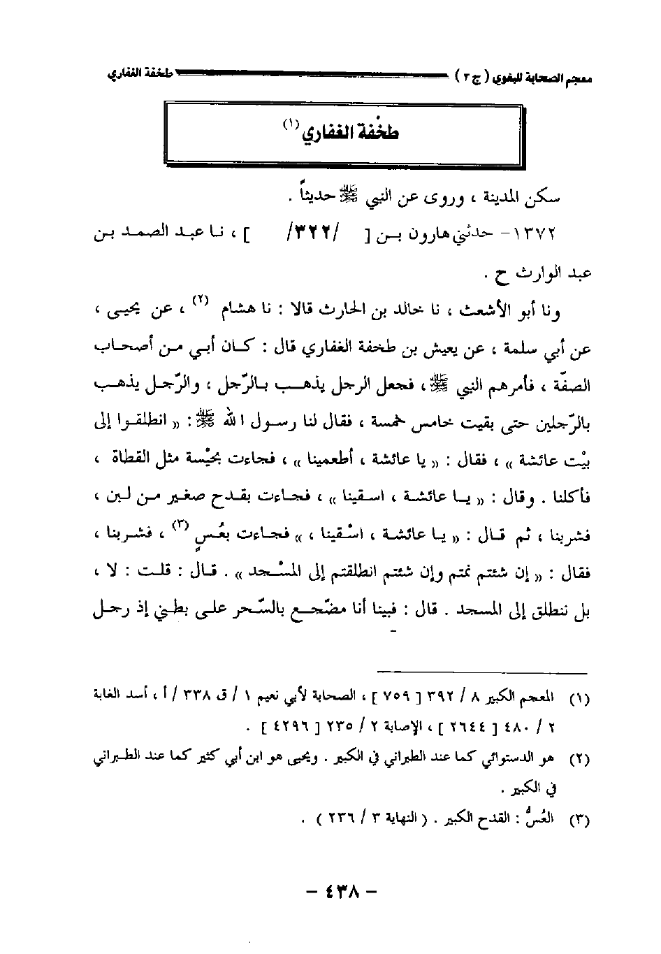 ونا أبو الأشعث نا خالد بن الحارث قالا: نا هشام عن يحيى عن أبي سلمة عن يعيش بن طخفة الغفاري قال: كان أبي من أصحاب الصفة فأمرهم النبي صلى الله عليه وسلم فجعل الرجل يذهب بالرجل والرجل يذهب بالرجلين حتى بقيت خامس خمسة فقال لنا رسول الله صلى الله عليه وسلم: " انطلقوا إلى بيت عائشة " فقال: " يا عائشة أطعمينا " فجاءت بحيسة مثل القطاة فأكلنا. وقال: " يا عائشة اسقينا " فجاءت بقدح صغير من لبن فشربنا ثم قال: " يا عائشة اسقينا " فجاءت بعس فشربنا فقال: " إن شئتم نمتم وإن شئتم انطلقتم إلى المسجد ". قال: قلت: لا، بل ننطلق إلى المسجد. قال: فبينا أنا مضجع بالسحر على بطني إذ رجل