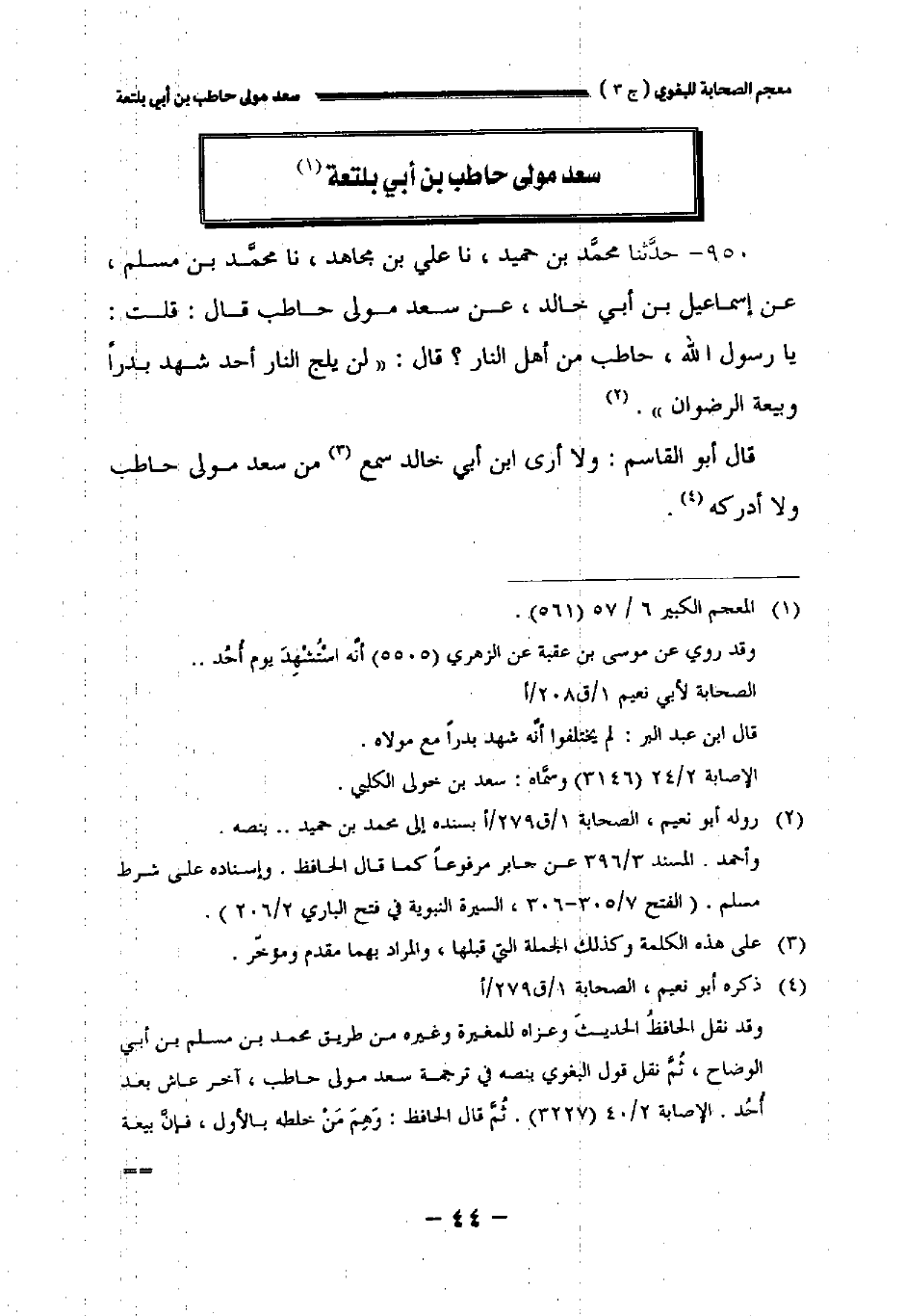 ٩٥٠ - حدثنا محمد بن حميد نا علي بن مجاهد نا محمد بن مسلم عن إسماعيل بن أبي خالد عن سعد مولى حاطب قال: قلت: يارسول الله حاطب من أهل النار؟ قال: " لن يلج النار أحد شهد بدرا وبيعة الرضوان.