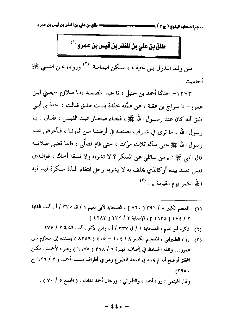 ١٣٧٣ - حدثنا أحمد بن حنبل نا عبد الصمد نا ملازم - يعني ابن عمرو - نا سراج بن عقبة عن عمته خلدة بنت طلق قالت: حدثني أبي طلق أنه كان عند رسول الله صلى الله عليه وسلم فجاء صحار عبد القيس فقال: يا رسول الله صلى الله عليه وسلم ما ترى في شراب نصنعه في أرضنا من ثمارنا فأعرض عنه رسول الله صلى الله عليه وسلم حتى سأله ثلاث مرات حتى قام فصلى فلما قضى صلاته قال النبي صلى الله عليه وسلم: " من سائلي عن المسكر؟ لا تشربه ولا تسقه أخاك فوالذي نفس محمد بيده أو كالذي يحلف به لا يشربه رجل ابتغاء لذة سكرة فيسقيه الله الخمر يوم القيامة.