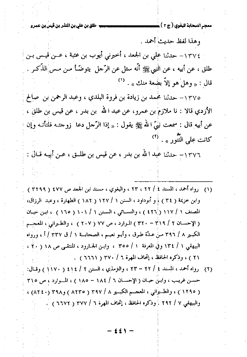١٣٧٤ - حدثنا علي بن الجعد أخبرني أيوب بن عتبة عن قيس بن طلق عن أبيه عن النبي صلى الله عليه وسلم أنه سئل عن الرجل يتوضأ من مس الذكر قال: " وهل هو إلا بضعة منك ".