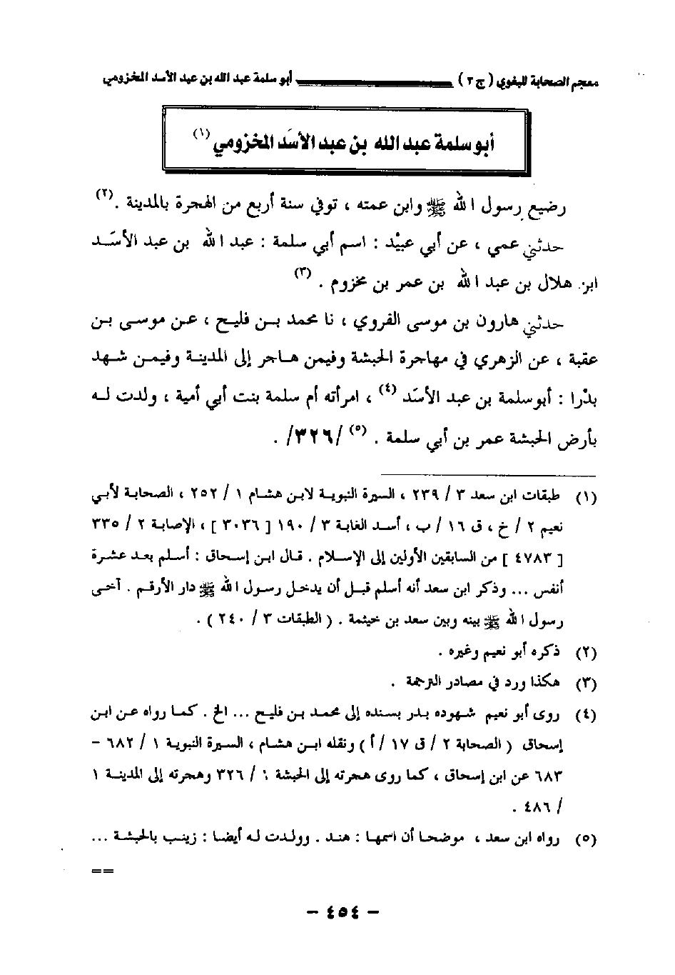 حدثني هارون بن موسى الفروي نا محمد بن فليح عن موسى بن عقبة عن الزهري في مهاجرة الحبشة وفيمن هاجر إلى المدينة وفيمن شهد بدرا: أبو سلمة بن عبد الأسد امرأته أم سلمة بنت أبي أمية ولدت له بأرض الحبشة عمر بن أبي سلمة.//٣٢٦//.