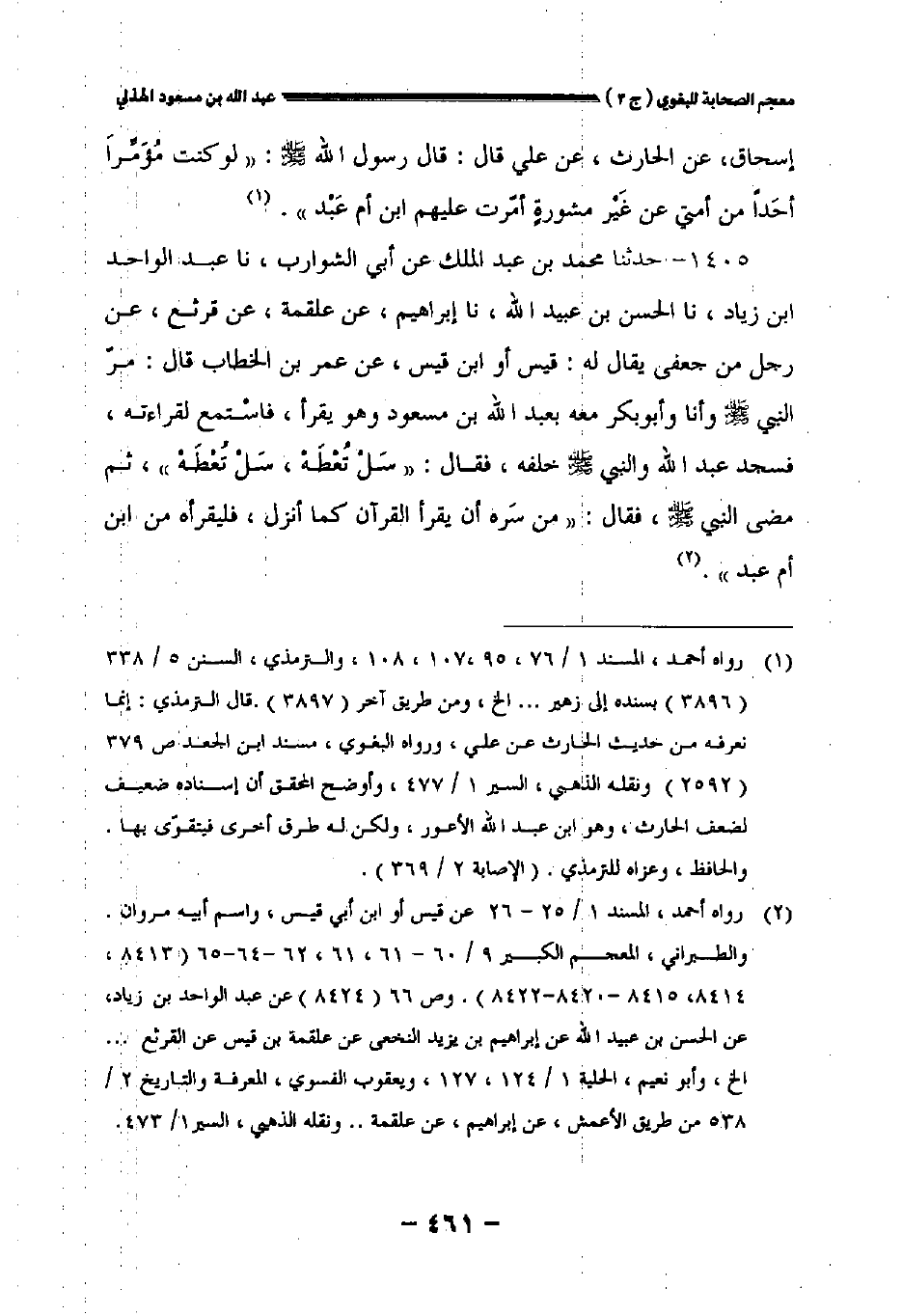 ١٤٠٥ - حدثنا محمد بن عبد الملك عن أبي الشوارب نا عبد الواحد بن زياد نا الحسن بن عبيد الله نا إبراهيم عن علقمة عن قرثع عن رجل من جعفى يقال له: قيس أو ابن قيس عن عمر بن الخطاب قال: مر النبي صلى الله عليه وسلم وأنا وأبو بكر معه بعبد الله بن مسعود وهو يقرأ فاستمع لقراءته فسجد عبد الله والنبي صلى الله عليه وسلم خلفه فقال: " سل تعطه سل تعطه " ثم مضى النبي صلى الله عليه وسلم فقال: " من سره أن يقرأ القرآن كما أنزل فليقرأه من ابن أم عبد.
