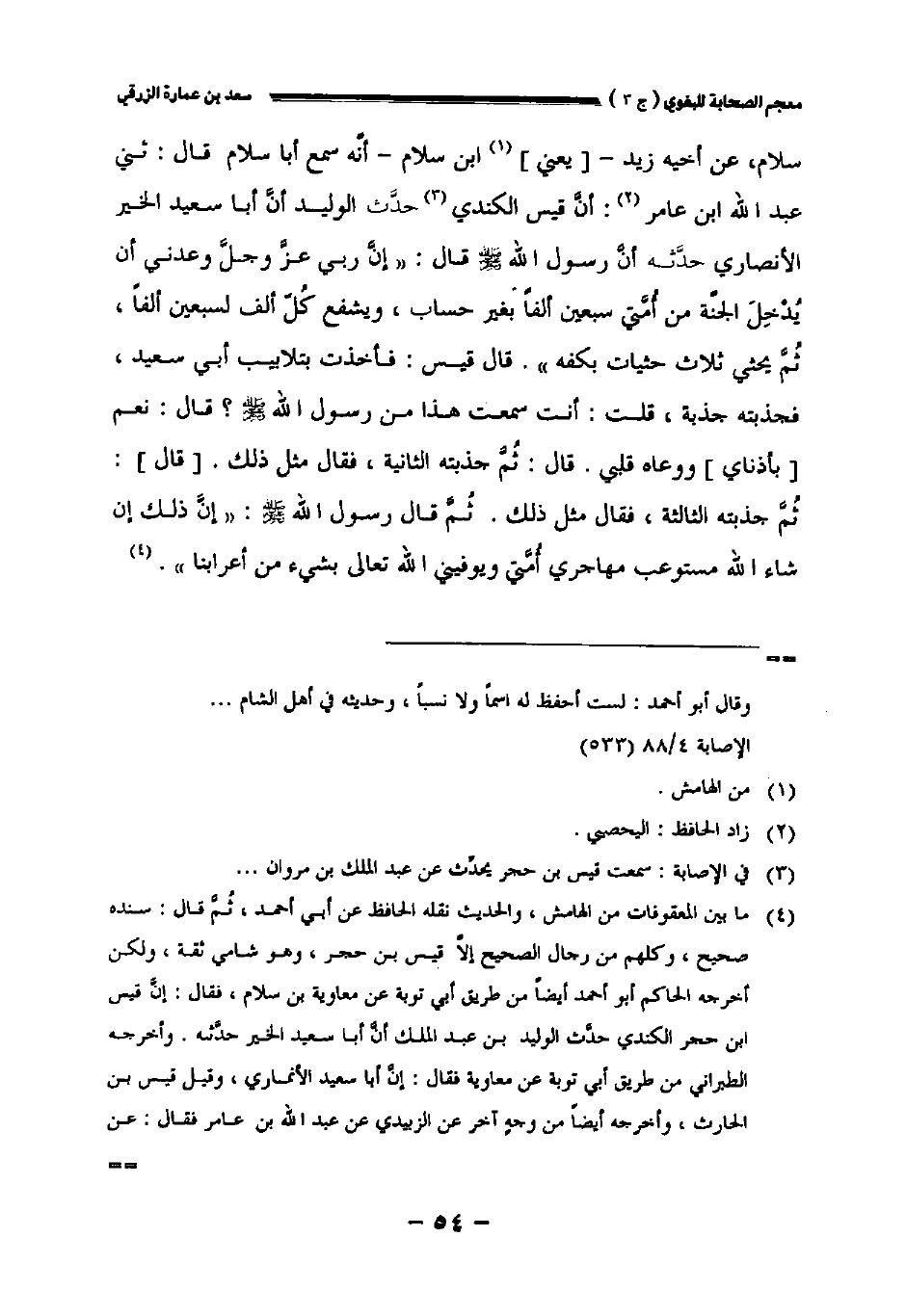سلام عن أخيه زيد [يعني] ابن سلام أنه سمع أبا سلام قال: حدثني عبد الله بن عامر: أن قيس الكندي حدث الوليد أن أبا سعيد الخير الأنصاري حدثه أن رسول الله صلى الله عليه وسلم قال: " إن ربي عز وجل وعدني أن يدخل الجنة من أمتي سبعين ألفا بغير حساب ويشفع كل ألف لسبعين ألفا ثم يحثي ثلاث حثيات بكفه ". قال قيس: فأخذت بتلابيب أبي سعيد فجذبته جذبه قلت: أنت سمعت هذا من رسول الله صلى الله عليه وسلم؟ قال: نعم [بأذناي] ووعاه قلبي. قال: ثم جذبته الثانية فقال مثل ذلك. [قال]: ثم جذبته الثالثة فقال مثل ذلك. ثم قال رسول الله صلى الله عليه وسلم: " إن ذلك إن شاء الله مستوعب مهاجري أمتي ويوفيني الله تعالى بشيء من أعرابنا.