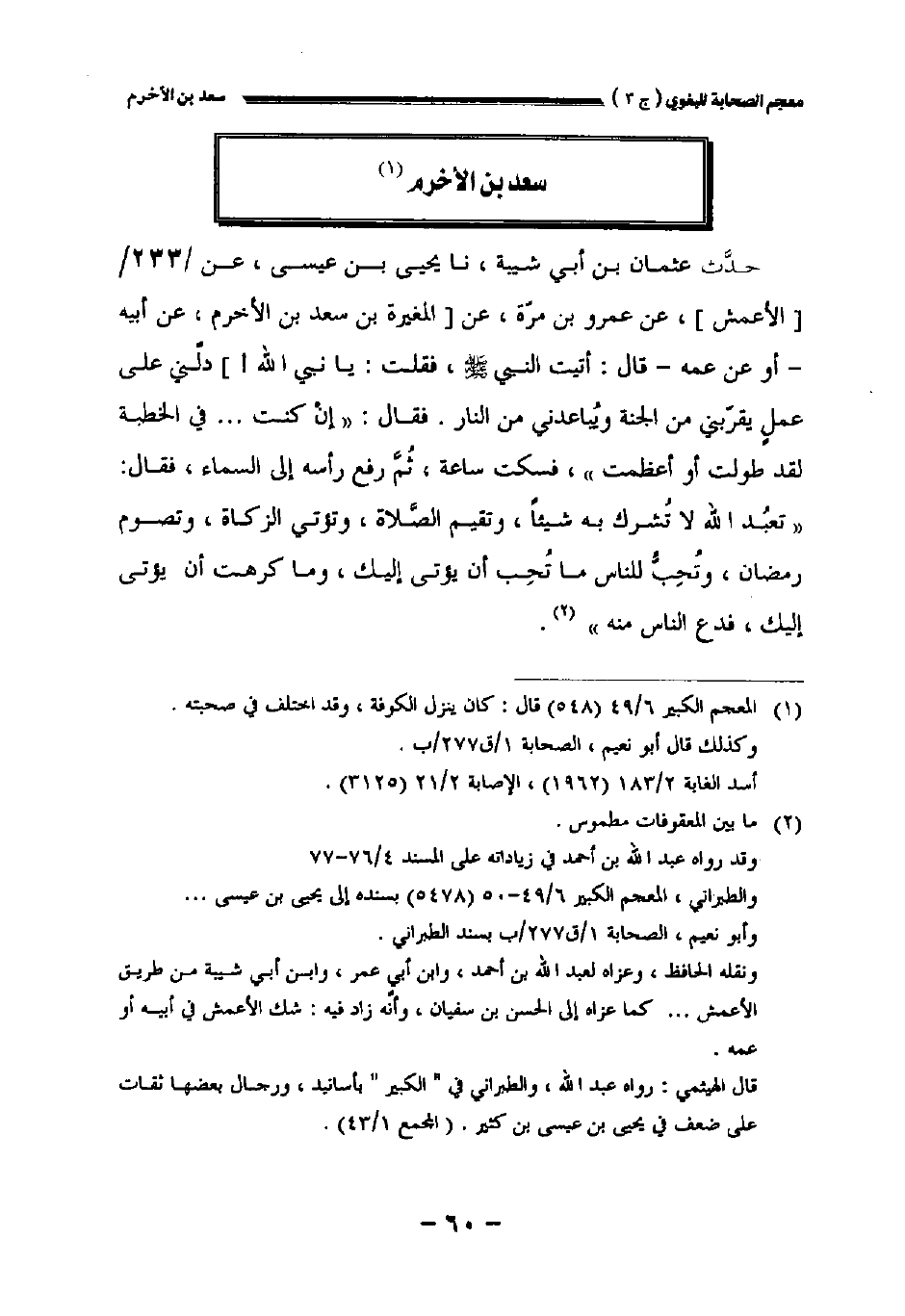 حدث عثمان بن أبي شيبة نا يحيى بن عيسى عن //٢٣٣// [الأعمش] عن عمرو بن مرة عن [المغيرة بن سعد بن الأخرم عن أبيه أو عن عمه قال: أتيت النبي صلى الله عليه وسلم فقلت: يانبي الله!] دلني على عمل يقربني من الجنة ويباعدني من النار. فقال: " إن كنت ... في الخطبة لقد طولت أو أعظمت " فسكت ساعة ثم رفع رأسه إلى السماء فقال: " تعبد الله لا تشرك به شيئا وتقيم الصلاة وتؤتي الزكاة وتصوم رمضان وتحب للناس ما تحب أن يؤتى إليك وما كرهت أن يؤتى إليك فدع الناس منه.