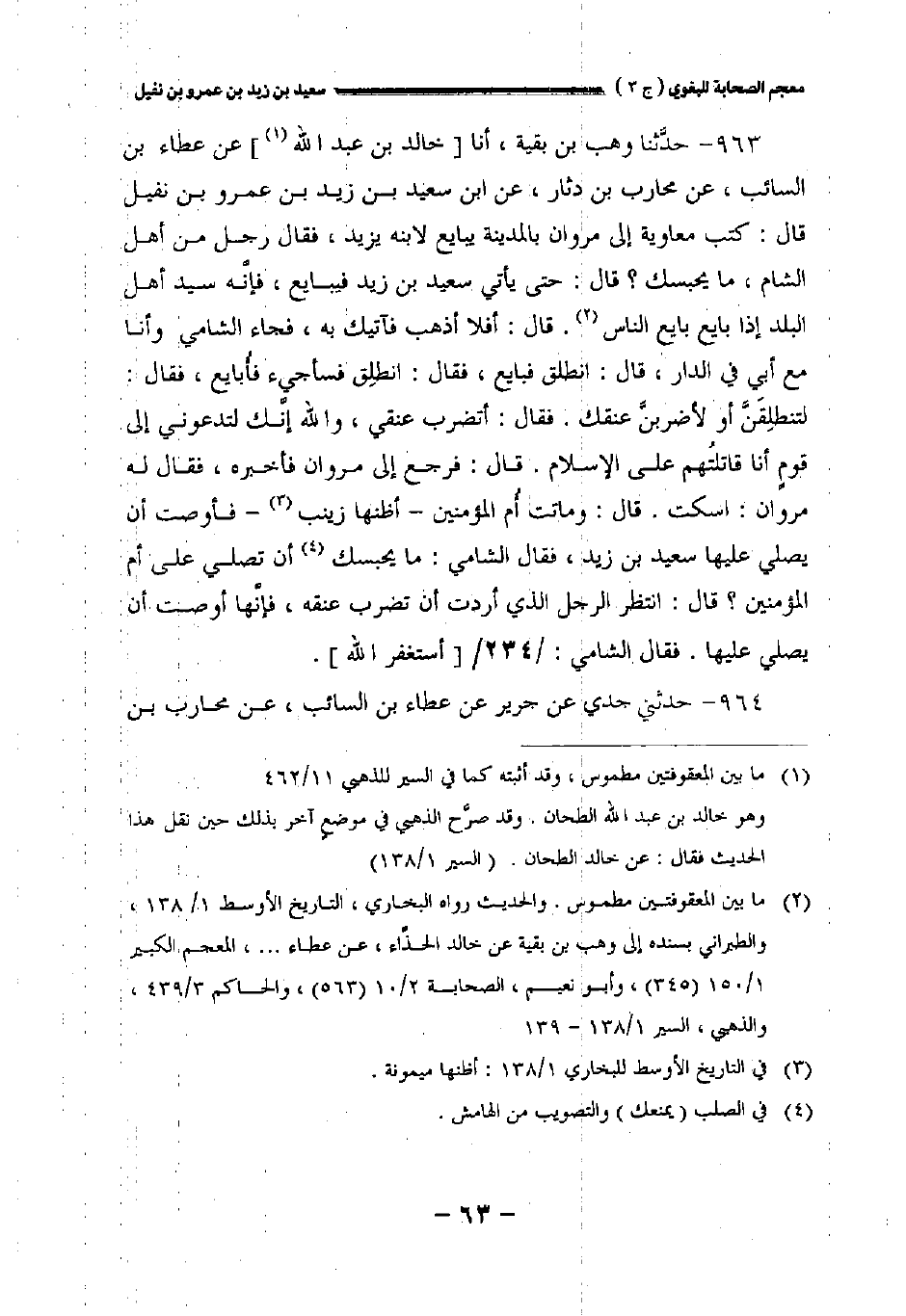 ٩٦٣ - حدثنا وهب بن بقية أخبرنا [خالد بن عبد الله] عن عطاء بن السائب عن محارب بن دثار عن ابن سعيد بن زيد بن عمرو بن نفيل قال: كتب معاوية على مروان بالمدينة يبايع لابنه يزيد فقال رجل من أهل الشام ما يحبسك؟ قال: حتى يأتي سعيد بن زيد فيبايع فإنه سيد أهل البلد إذا بايع بايع الناس. قال: أفلا أذهب فآتيك به فجاء الشامي وأنا مع أبي في الدار قال: انطلق فبايع، فقال: انطلق فسأجيء فأبايع فقال: لتنطلقن أو لأضربن عنقك. فقال: أتضرب عنقي. والله إنك لتدعوني إلى قوم أنا قاتلتهم على الإسلام. قال: فرجع إلى مروان فأخبره فقال له مروان: اسكت. قال: وماتت أم المؤمنين - أظنها زينب - فأوصت أن يصلي عليها سعيد بن زيد فقال الشامي: ما يحبسك ان تصلي على أم المؤمنين؟ قال: انتظر الرجل الذي أردت أن تضرب عنقه فإنها أوصت أن يصلي عليها. فقال الشامي: //٢٣٤// [أستغفر الله].
