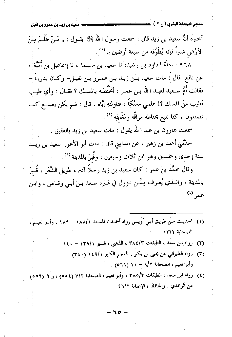 ٩٦٨ - حدثنا داود بن رشيد نا سعيد بن مسلمة نا إسماعيل بن أمية عن نافع قال: مات سعيد بن زيد بن عمرو بن نفيل وكان بدريا فقالت أم سعيد لعبد الله بن عمر: أنحنطه بالمسك؟ فقال: وأي طيب أطيب من المسك؟ هلمي مسكا فناولته إياه. قال: فلم يكن يصنع كما تصنعون كنا نتبع بحناطه مراقه ومغابنه.