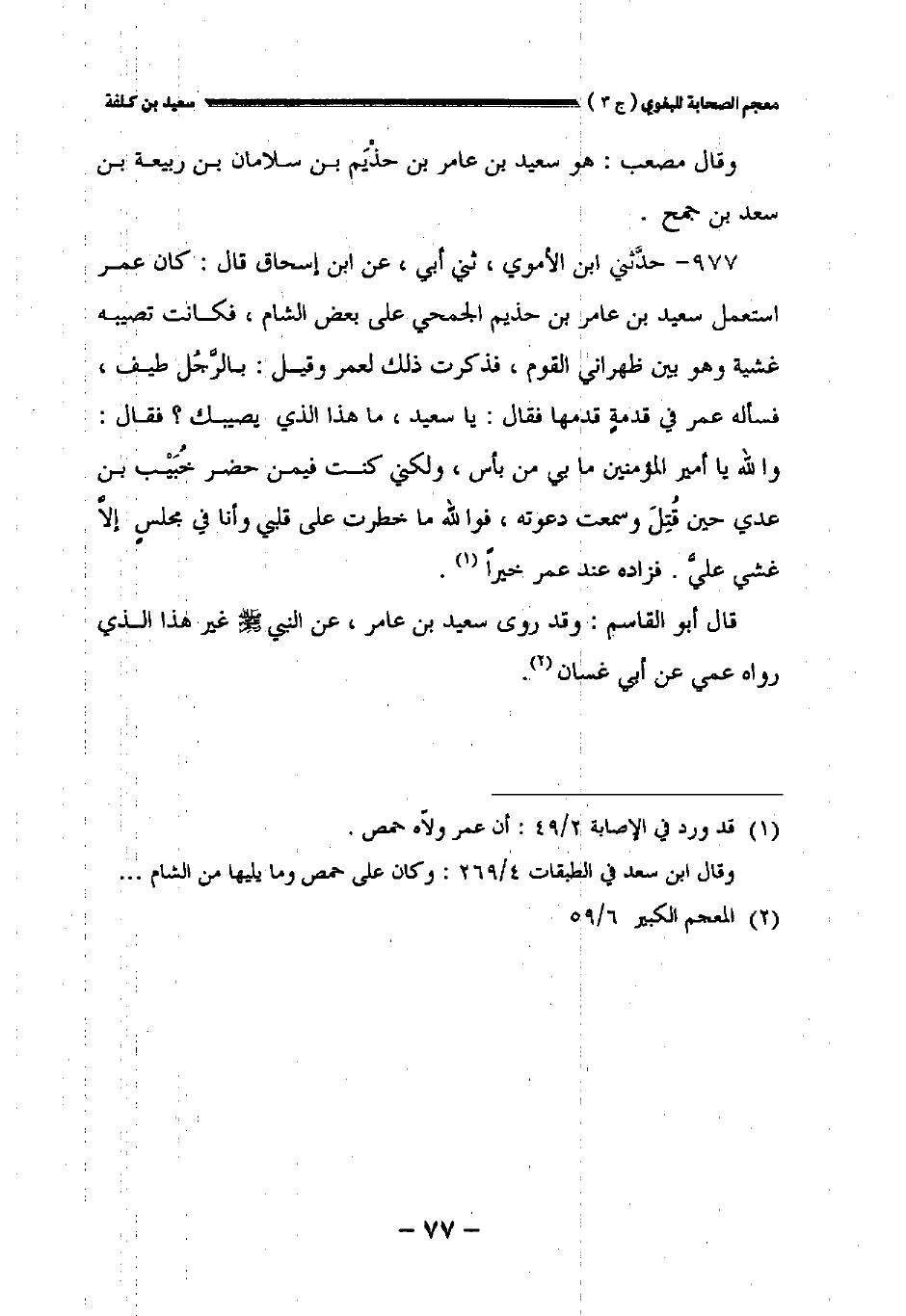 ٩٧٧ - حدثني ابن الأموي حدثني أبي عن ابن إسحاق قال: كان عمر استعمل سعيد بن عامر بن حذيم الجمحي على بعض الشام فكانت تصيبه غشية وهو بين ظهراني القوم فذكرت ذلك لعمر وقيل: بالرجل طيف فسأله عمر في قدمه قدمها فقال: ياسعيد ما هذا الذي يصيبك؟ فقال: والله ياأمير المؤمنين ما بي من بأس ولكني كنت فيمن حضر خبيب بن عدي حين قتل وسمعت دعوته فوالله ما خطرت على قلبي وأنا في مجلس إلا غشي علي. فزاده عند عمر خيرا.