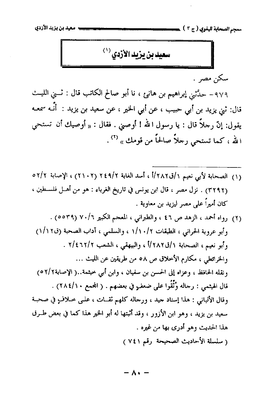 ٩٧٩ - حدثني إبراهيم بن هانىء نا أبو صالح الكاتب قال: حدثني الليث قال: حدثني يزيد بن أبي حبيب عن أبي الخير عن سعيد بن يزيد: أنه سمعه يقول: إن رجلا قال: يارسول الله! أوصني. فقال: " أوصيك أن تستحي الله كما تستحي رجلا صالحا من قومك.