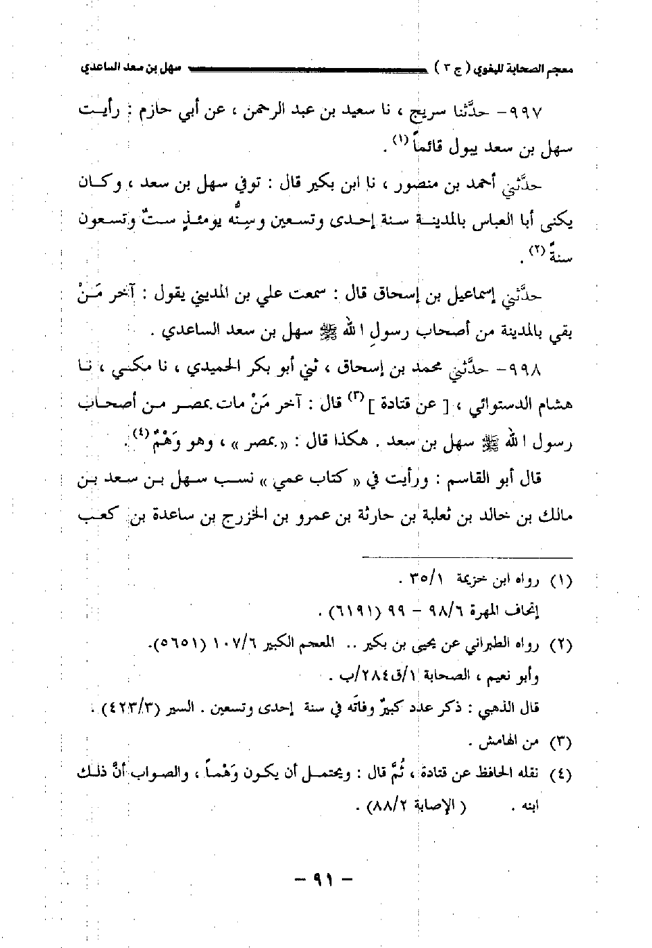 حدثني أحمد بن منصور نا ابن بكير قال: توفي سهل بن سعد وكان يكنى أبا العباس بالمدينة سنة إحدى وتسعين وسنه يومئذ ست وتسعون سنة.