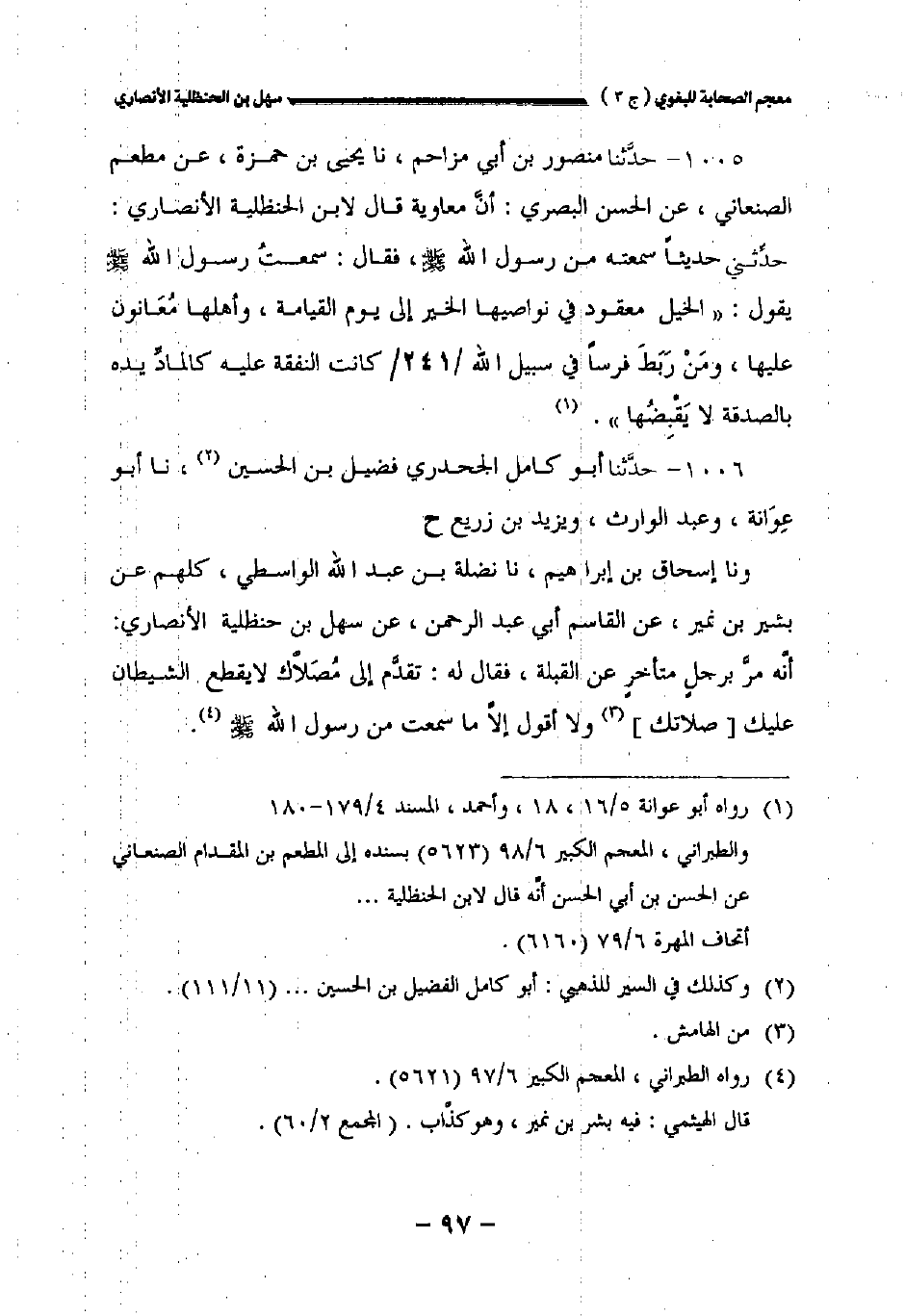 ١٠٠٥ - حدثنا منصور بن أبي مزاحم نا يحيى بن حمزة عن مطعم الصنعاني عن الحسن البصري: أن معاوية قال لابن الحنظلية الأنصاري: حدثني حديثا سمعته من رسول الله صلى الله عليه وسلم فقال: سمعت رسول الله صلى الله عليه وسلم يقول: " الخيل معقود في نواصيها الخير على يوم القيامة وأهلها معانون عليها ومن ربط فرسا في سبيل الله //٢٤١//كانت النفقة عليه كالماد يده بالصدقة لا يقبضها.