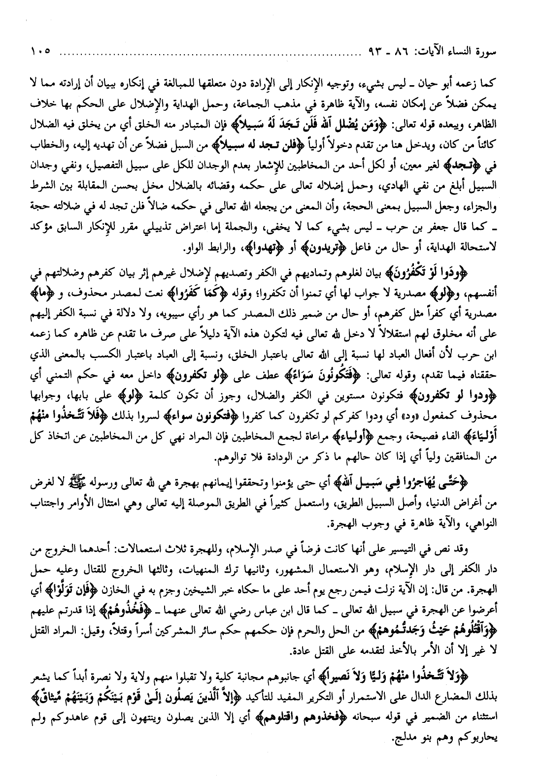 وَدُّوا لَوْ تَكْفُرُونَ بيان لغلوهم وتماديهم في الكفر وتصديهم لإضلال غيرهم إثر بيان كفرهم وضلالتهم في أنفسهم، ولَوْ مصدرية لا جواب لها أي تمنوا أن تكفروا وقوله كَما كَفَرُوا نعت لمصدر محذوف، وما مصدرية أي كفرا مثل كفرهم، أو حال من ضمير ذلك المصدر كما هو رأي سيبويه، ولا دلالة في نسبة الكفر إليهم على أنه مخلوق لهم استقلالا لا دخل لله تعالى فيه لتكون هذه الآية دليلا على صرف ما تقدم عن ظاهره كما زعمه ابن حرب لأن أفعال العباد لها نسبة إلى الله تعالى باعتبار الخلق، ونسبة إلى العباد باعتبار الكسب بالمعنى الذي حققناه فيما تقدم، وقوله تعالى: فَتَكُونُونَ سَواءً عطف على لَوْ تَكْفُرُونَ داخل معه في حكم التمني أي وَدُّوا لَوْ تَكْفُرُونَ فتكونون مستوين في الكفر والضلال، وجوز أن تكون كلمة لَوْ على بابها، وجوابها محذوف كمفعول «ود» أي ودوا كفركم لو تكفرون كما كفروا فَتَكُونُونَ سَواءً لسروا بذلك فَلا تَتَّخِذُوا مِنْهُمْ أَوْلِياءَ الفاء فصيحة، وجمع أَوْلِياءَ مراعاة لجمع المخاطبين فإن المراد نهي كل من المخاطبين عن اتخاذ كل من المنافقين وليا أي إذا كان حالهم ما ذكر من الودادة فلا توالوهم.