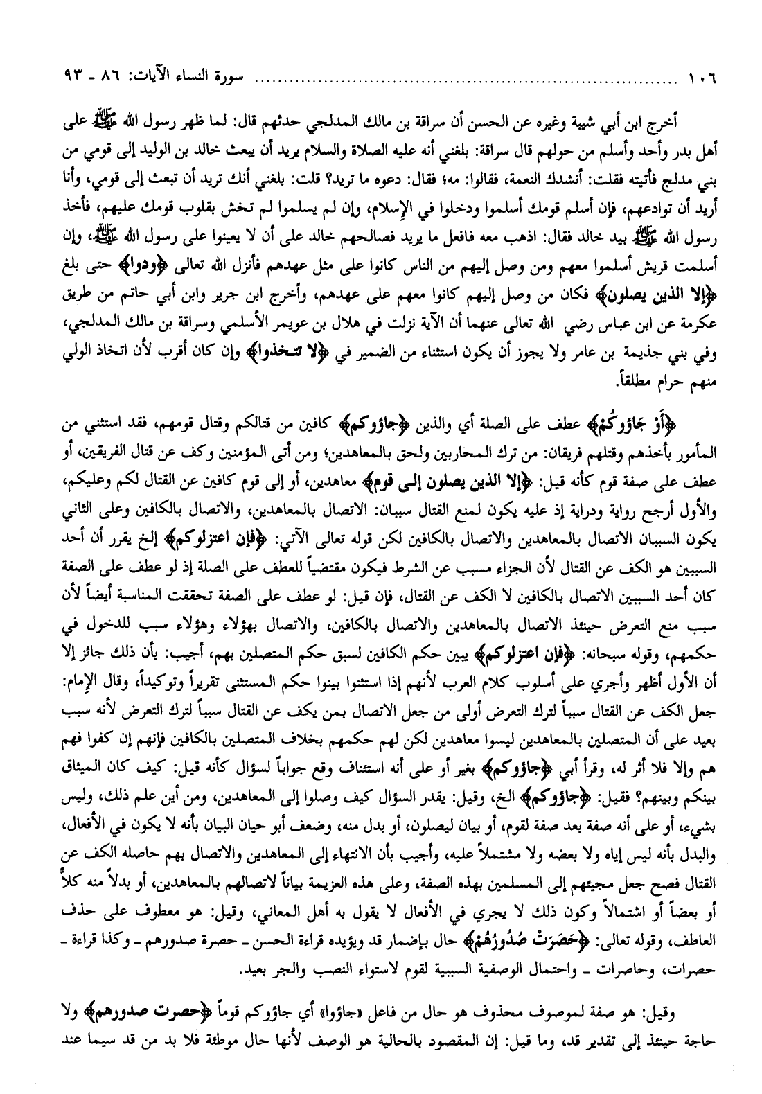 أخرج ابن أبي شيبة وغيره عن الحسن أن سراقة بن مالك المدلجي حدثهم قال: لما ظهر رسول الله صلّى الله عليه وسلّم على أهل بدر وأحد وأسلم من حولهم قال سراقة: بلغني أنه عليه الصلاة والسلام يريد أن يبعث خالد بن الوليد إلى قومي من بني مدلج فأتيته فقلت: أنشدك النعمة، فقالوا: مه فقال: دعوه ما تريد؟ قلت: بلغني أنك تريد أن تبعث إلى قومي، وأنا أريد أن توادعهم، فإن أسلم قومك أسلموا ودخلوا في الإسلام، وإن لم يسلموا لم تخش بقلوب قومك عليهم، فأخذ رسول الله صلّى الله عليه وسلّم بيد خالد فقال: اذهب معه فافعل ما يريد فصالحهم خالد على أن لا يعينوا على رسول الله صلّى الله عليه وسلّم، وإن أسلمت قريش أسلموا معهم ومن وصل إليهم من الناس كانوا على مثل عهدهم فأنزل الله تعالى وَدُّوا حتى بلغ إِلَّا الَّذِينَ يَصِلُونَ