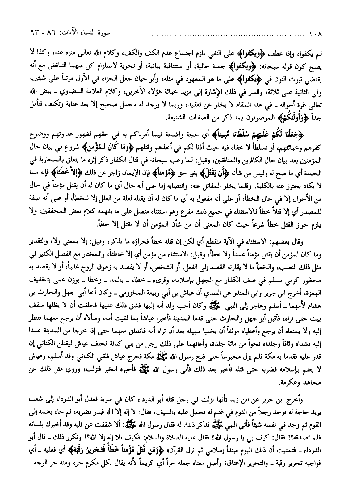 أخرج ابن جرير وابن المنذر عن السدي أن عياش بن أبي ربيعة المخزومي- وكان أخا أبي جهل والحارث بن هشام لأمهما- أسلم وهاجر إلى النبي صلّى الله عليه وسلّم وكان أحب ولد أمه إليها فشق ذلك عليها فحلفت أن لا يظلها سقف بيت حتى تراه، فأقبل أبو جهل والحارث حتى قدما المدينة فأخبرا عياشا بما لقيت أمه، وسألاه أن يرجع معهما فتنظر إليه ولا يمنعاه أن يرجع وأعطياه موثقا أن يخليا سبيله بعد أن تراه أمه فانطلق معهما حتى إذا خرجا من المدينة عمدا إليه فشداه وثاقا وجلداه نحوا من مائة جلدة، وأعانهما على ذلك رجل من بني كنانة فحلف عياش ليقتلن الكناني إن قدر عليه فقدما به مكة فلم يزل محبوسا حتى فتح رسول الله صلّى الله عليه وسلّم مكة فخرج عياش فلقي الكناني وقد أسلم، وعياش لا يعلم بإسلامه فضربه حتى قتله فأخبر بعد ذلك فأتى رسول الله صلّى الله عليه وسلّم فأخبره الخبر فنزلت، وروي مثل ذلك عن مجاهد وعكرمة.
