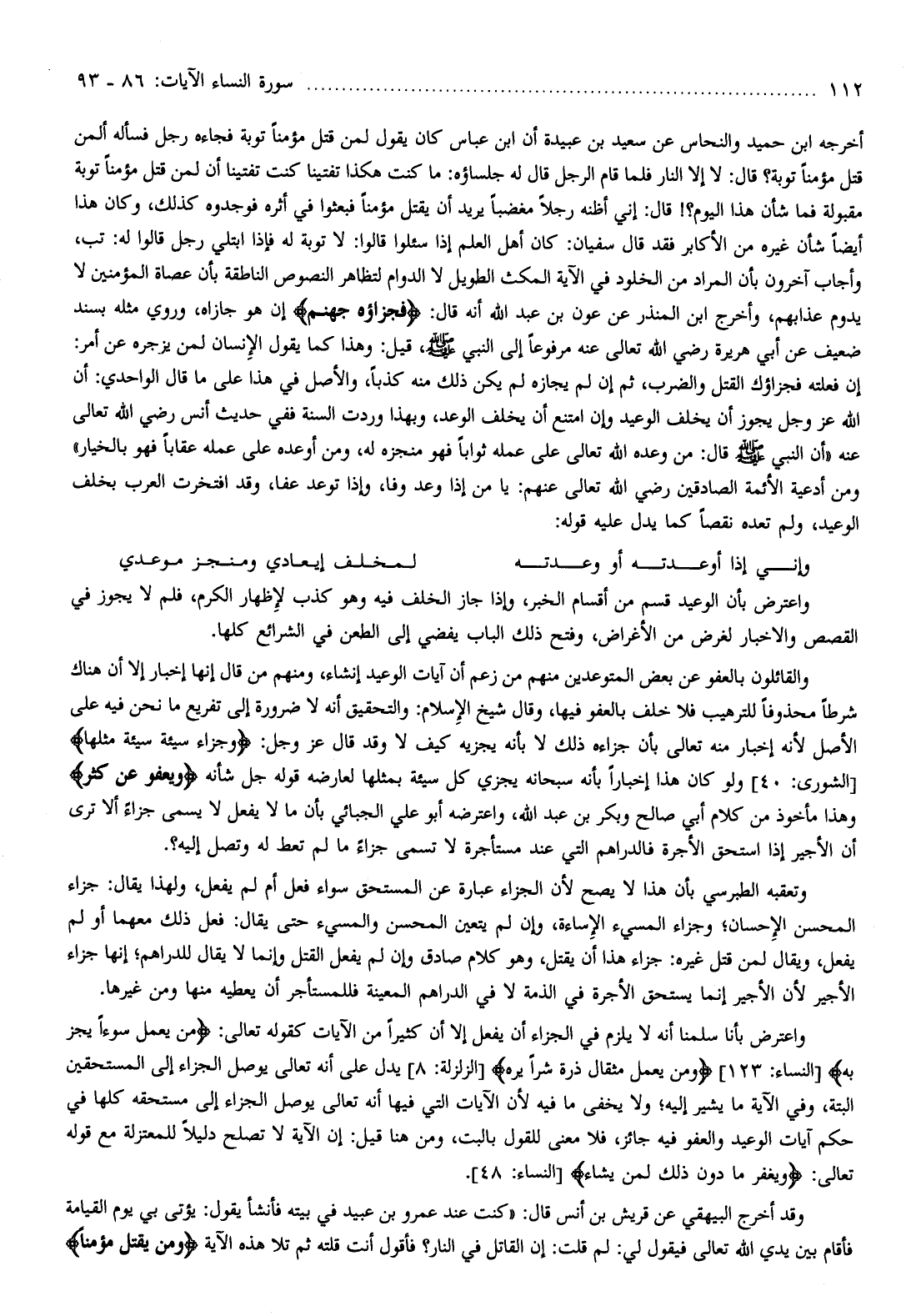 وقد أخرج البيهقي عن قريش بن أنس قال: «كنت عند عمرو بن عبيد في بيته فأنشأ يقول: يؤتى بي يوم القيامة فأقام بين يدي الله تعالى فيقول لي: لم قلت: إن القاتل في النار؟ فأقول أنت قلته ثم تلا هذه الآية وَمَنْ يَقْتُلْ مُؤْمِناً