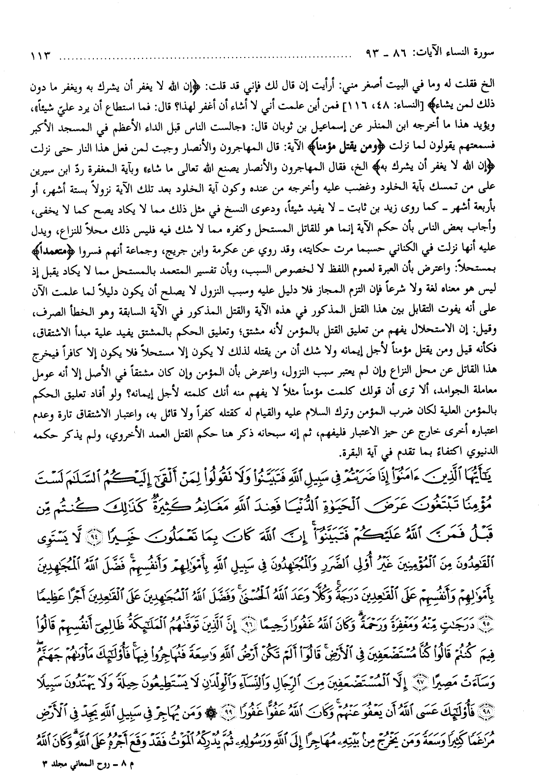 إلخ فقلت له وما في البيت أصغر مني: أرأيت إن قال لك فإني قد قلت: إِنَّ اللَّهَ لا يَغْفِرُ أَنْ يُشْرَكَ بِهِ وَيَغْفِرُ ما دُونَ ذلِكَ لِمَنْ يَشاءُ [النساء: 48، 116] فمن أين علمت أني لا أشاء أن أغفر لهذا؟ قال: فما استطاع أن يرد عليّ شيئا» ، ويؤيد هذا ما أخرجه ابن المنذر عن إسماعيل بن ثوبان قال: «جالست الناس قبل الداء الأعظم في المسجد الأكبر فسمعتهم يقولون لما نزلت وَمَنْ يَقْتُلْ مُؤْمِناً الآية: قال المهاجرون والأنصار وجبت لمن فعل هذا النار حتى نزلت إِنَّ اللَّهَ لا يَغْفِرُ أَنْ يُشْرَكَ بِهِ إلخ، فقال المهاجرون والأنصار يصنع الله تعالى ما شاء» وبآية المغفرة ردّ ابن سيرين على من تمسك بآية الخلود وغضب عليه وأخرجه من عنده وكون آية الخلود بعد تلك الآية نزولا بستة أشهر، أو بأربعة أشهر- كما روى زيد بن ثابت- لا يفيد شيئا، ودعوى النسخ في مثل ذلك مما لا يكاد يصح كما لا يخفى، وأجاب بعض الناس بأن حكم الآية إنما هو للقاتل المستحل وكفره مما لا شك فيه فليس ذلك محلا للنزاع، ويدل عليه أنها نزلت في الكناني حسبما مرت حكايته، وقد روي عن عكرمة وابن جريج، وجماعة أنهم فسروا مُتَعَمِّداً بمستحلا: واعترض بأن العبرة لعموم اللفظ لا لخصوص السبب، وبأن تفسير المتعمد بالمستحل مما لا يكاد يقبل إذ ليس هو معناه لغة ولا شرعا فإن التزم المجاز فلا دليل عليه وسبب النزول لا يصلح أن يكون دليلا لما علمت الآن على أنه يفوت التقابل بين هذا القتل المذكور في هذه الآية والقتل المذكور في الآية السابقة وهو الخطأ الصرف، وقيل: إن الاستحلال يفهم من تعليق القتل بالمؤمن لأنه مشتق وتعليق الحكم بالمشتق يفيد علية مبدأ الاشتقاق، فكأنه قيل ومن يقتل مؤمنا لأجل إيمانه ولا شك أن من يقتله لذلك لا يكون إلا مستحلا فلا يكون إلا كافرا فيخرج هذا القاتل عن محل النزاع وإن لم يعتبر سبب النزول، واعترض بأن المؤمن وإن كان مشتقا في الأصل إلا أنه عومل معاملة الجوامد، ألا ترى أن قولك كلمت مؤمنا مثلا لا يفهم منه أنك كلمته لأجل إيمانه؟ ولو أفاد تعليق الحكم بالمؤمن العلية لكان ضرب المؤمن وترك السلام عليه والقيام له كقتله كفرا ولا قائل به، واعتبار الاشتقاق تارة وعدم اعتباره أخرى خارج عن حيز الاعتبار فليفهم، ثم إنه سبحانه ذكر هنا حكم القتل العمد الأخروي، ولم يذكر حكمه الدنيوي اكتفاء بما تقدم في آية البقرة.
