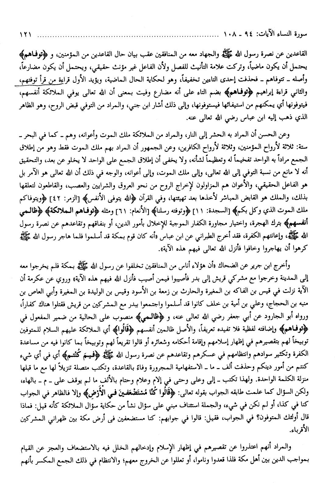 القاعدين عن نصرة رسول الله صلّى الله عليه وسلّم والجهاد معه من المنافقين عقب بيان حال القاعدين من المؤمنين، وتَوَفَّاهُمُ يحتمل أن يكون ماضيا، وتركت علامة التأنيث للفصل ولأن الفاعل غير مؤنث حقيقي، ويحتمل أن يكون مضارعا، وأصله- تتوفاهم- فحذفت إحدى التاءين تخفيفا، وهو لحكاية الحال الماضية، ويؤيد الأول قراءة من قرأ توفتهم، والثاني قراءة إبراهيم تَوَفَّاهُمُ بضم التاء على أنه مضارع وفيت بمعنى أن الله تعالى يوفي الملائكة أنفسهم، فيتوفونها أي يمكنهم من استيفائها فيستوفونها، وإلى ذلك أشار ابن جني، والمراد من التوفي قبض الروح، وهو الظاهر الذي ذهب إليه ابن عباس رضي الله تعالى عنه.