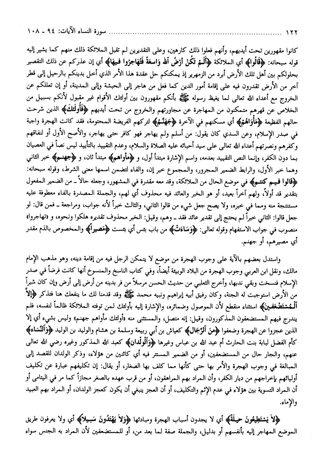 واستدل بعضهم بالآية على وجوب الهجرة من موضع لا يتمكن الرجل فيه من إقامة دينه، وهو مذهب الإمام مالك، ونقل ابن العربي وجوب الهجرة من البلاد الوبيئة أيضا، وفي كتاب الناسخ والمنسوخ أنها كانت فرضا في صدر الإسلام فنسخت وبقي ندبها، وأخرج الثعلبي من حديث الحسن مرسلا من فر بدينه من أرض إلى أرض وإن كان شبرا من الأرض استوجبت له الجنة، وكان رفيق أبيه إبراهيم ونبيه محمد صلّى الله عليه وسلّم وقد قدمنا لك ما ينفعك هنا فتذكر إِلَّا الْمُسْتَضْعَفِينَ استثناء منقطع لأن الموصول وضمائره، والإشارة إليه بأولئك لمن توفته الملائكة ظالما لنفسه، فلم يندرج فيهم المستضعفون المذكورون، وقيل: إنه متصل، والمستثنى منه «أولئك مأواهم جهنم» وليس بشيء أي إلا الذين عجزوا عن الهجرة وضعفوا مِنَ الرِّجالِ كعياش بن أبي ربيعة وسلمة بن هشام والوليد بن الوليد وَالنِّساءِ كأم الفضل لبابة بنت الحارث أم عبد الله بن عباس وغيرها وَالْوِلْدانِ كعبد الله المذكور وغيره رضي الله تعالى عنهم، والجار حال من المستضعفين، أو من الضمير المستتر فيه أي كائنين من هؤلاء، وذكر الولدان للقصد إلى المبالغة في وجوب الهجرة والأمر بها حتى كأنها مما كلف بها الصغار، أو يقال: إن تكليفهم عبارة عن تكليف أوليائهم بإخراجهم من ديار الكفر، وأن المراد بهم المراهقون، أو من قرب عهده بالصغر مجازا كما مر في اليتامى أو أن المراد التسوية بين هؤلاء في عدم الإثم والتكليف، أو أن العجز ينبغي أن يكون كعجز الولدان، أو المراد بهم العبيد والإماء.