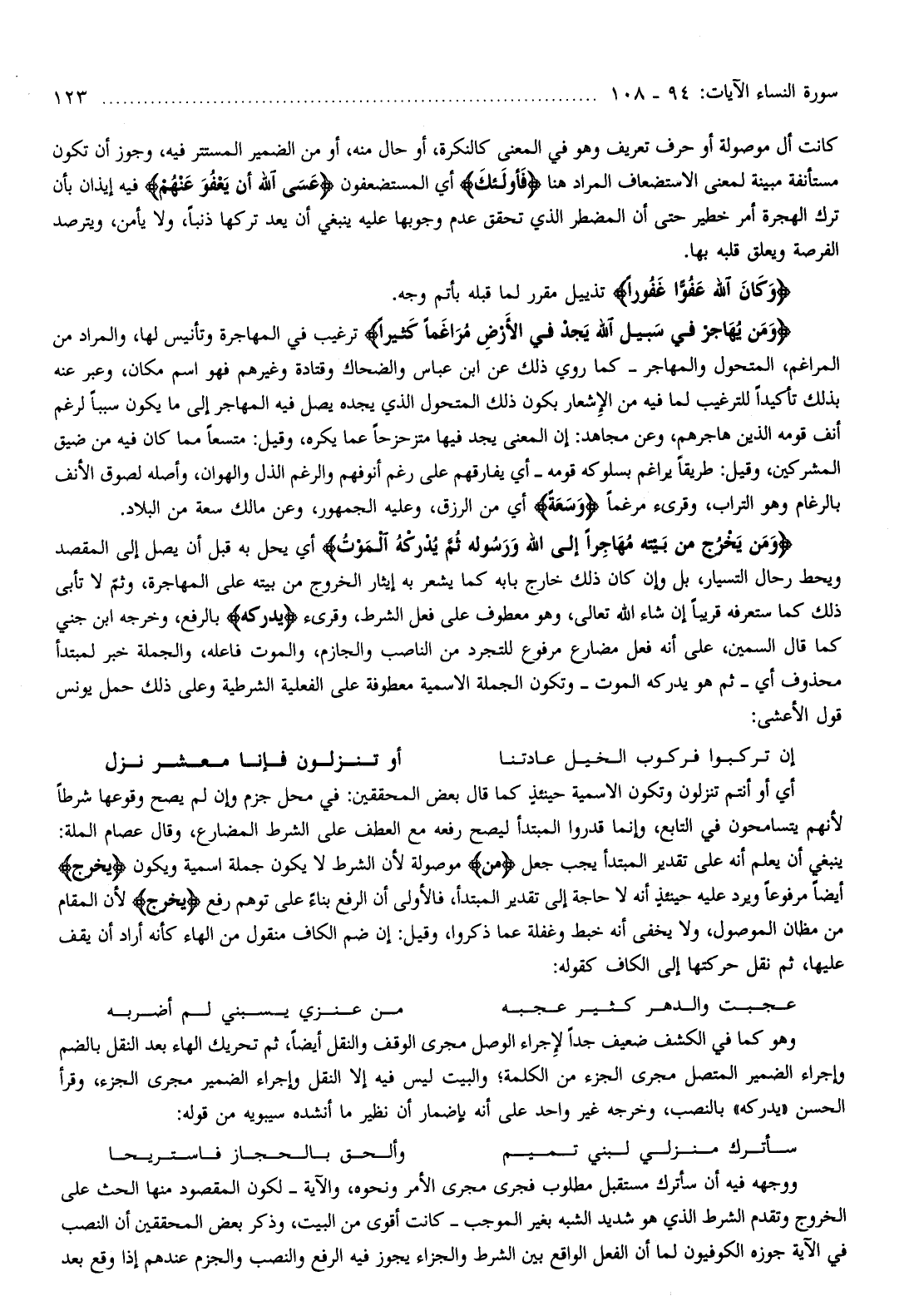 وَمَنْ يَخْرُجْ مِنْ بَيْتِهِ مُهاجِراً إِلَى اللَّهِ وَرَسُولِهِ ثُمَّ يُدْرِكْهُ الْمَوْتُ أي يحل به قبل أن يصل إلى المقصد ويحط رحال التسيار، بل وإن كان ذلك خارج بابه كما يشعر به إيثار الخروج من بيته على المهاجرة، وثمّ لا تأبى ذلك كما ستعرفه قريبا إن شاء الله تعالى، وهو معطوف على فعل الشرط، وقرىء يُدْرِكْهُ بالرفع، وخرجه ابن جني كما قال السمين، على أنه فعل مضارع مرفوع للتجرد من الناصب والجازم، والموت فاعله، والجملة خبر لمبتدأ محذوف أي- ثم هو يدركه الموت- وتكون الجملة الاسمية معطوفة على الفعلية الشرطية وعلى ذلك حمل يونس قول الأعشى: