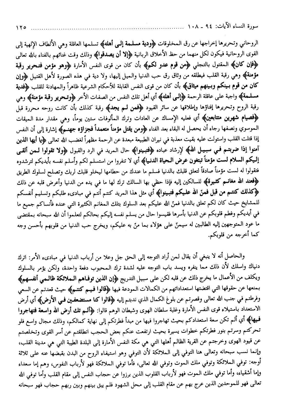 الروحاني وتحريرها إخراجها عن رق المخلوقات وَدِيَةٌ مُسَلَّمَةٌ إِلى أَهْلِهِ تسلمها العاقلة وهي الألطاف الإلهية إلى القوى الروحانية فيكون لكل منهما من حظ الأخلاق الربانية إِلَّا أَنْ يَصَّدَّقُوا وذلك وقت غنائهم بالفناء بالله تعالى فَإِنْ كانَ المقتول بالتجلي مِنْ قَوْمٍ عَدُوٍّ لَكُمْ بأن كان من قوى النفس الأمارة وَهُوَ مُؤْمِنٌ فَتَحْرِيرُ رَقَبَةٍ مُؤْمِنَةٍ وهي رقبة القلب فيطلقه من وثاق رق حب الدنيا والميل إليها، ولا دية في هذه الصورة لأهل القتيل وَإِنْ كانَ مِنْ قَوْمٍ بَيْنَكُمْ وَبَيْنَهُمْ مِيثاقٌ بأن كان من قوى النفس القابلة للأحكام الشرعية ظاهرا والمهادنة للقلب فَدِيَةٌ مُسَلَّمَةٌ واجبة على عاقلة الرحمة إِلى أَهْلِهِ أي أهل تلك النفس من الصفات الأخر وَتَحْرِيرُ رَقَبَةٍ مُؤْمِنَةٍ وهي رقبة الروح وتحريرها إفناؤها وإطلاقها عن سائر القيود فَمَنْ لَمْ يَجِدْ رقبة كذلك بأن كانت روحه محررة قبل فَصِيامُ شَهْرَيْنِ مُتَتابِعَيْنِ أي فعليه الإمساك عن العادات وترك المألوفات ستين يوما، وهي مقدار مدة الميقات الموسوي ونصفها رجاء أن يحصل له البقاء بعد الفناء وَمَنْ يَقْتُلْ مُؤْمِناً مُتَعَمِّداً فَجَزاؤُهُ جَهَنَّمُ إشارة إلى أن النفس إذا قتلت القلب واستولت عليه بقيت معذبة في نيران الطبيعة مبعدة عن الرحمة مظهرا لغضب الله تعالى يا أَيُّهَا الَّذِينَ آمَنُوا إِذا ضَرَبْتُمْ فِي سَبِيلِ اللَّهِ لإرشاد عباده فَتَبَيَّنُوا حال المريد في الرد والقبول وَلا تَقُولُوا لِمَنْ أَلْقى إِلَيْكُمُ السَّلامَ لَسْتَ مُؤْمِناً تَبْتَغُونَ عَرَضَ الْحَياةِ الدُّنْيا أي لا تنفروا من استسلم لكم وأسلم نفسه بأيديكم لترشدوه فتقولوا له لست مؤمنا صادقا لتعلق قلبك بالدنيا فسلم ما عندك من حطامها ليخلو قلبك لربك وتصلح لسلوك الطريق فَعِنْدَ اللَّهِ مَغانِمُ كَثِيرَةٌ للسالكين إليه فإذا حظي بها السالك ترك لها ما في يده من الدنيا وأعرض قلبه عن ذلك كَذلِكَ كُنْتُمْ مِنْ قَبْلُ فَمَنَّ اللَّهُ عَلَيْكُمْ فَتَبَيَّنُوا أي مثل هذا المريد كنتم أنتم في مبادئ طلبكم وتسليم أنفسكم للمشايخ حيث كان لكم تعلق بالدنيا فمنّ الله عليكم بعد السلوك بتلك المغانم الكثيرة التي عنده فأنساكم جميع ما في أيديكم وفطم قلوبكم عن الدنيا بأسرها فقيسوا حال من يسلم نفسه إليكم بحالكم لتعلموا أن الله سبحانه بمقتضى ما عود المتوجهين إليه الطالبين له سيمنّ على هؤلاء بما منّ به عليكم، ويخرج حب الدنيا من قلوبهم بأحسن وجه كما أخرجه من قلوبكم.