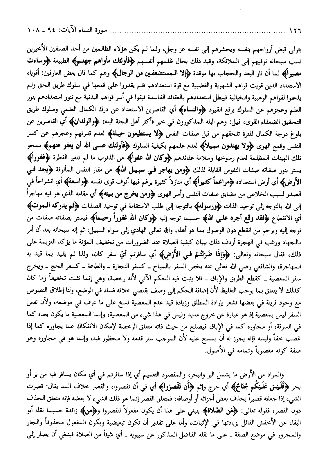 يتولى قبض أرواحهم بنفسه ويحشرهم إلى نفسه عز وجل، ولما لم يكن هؤلاء الظالمين من أحد الصنفين الأخيرين نسب سبحانه توفيهم إلى الملائكة، وقيد ذلك بحال ظلمهم أنفسهم فَأُولئِكَ مَأْواهُمْ جَهَنَّمُ الطبيعة وَساءَتْ مَصِيراً لما أن نار البعد والحجاب بها موقدة إِلَّا الْمُسْتَضْعَفِينَ مِنَ الرِّجالِ وهم كما قال بعض العارفين: أقوياء الاستعداد الذين قويت قواهم الشهوية والغضبية مع قوة استعدادهم فلم يقدروا على قمعها في سلوك طريق الحق ولم يذعنوا لقواهم الوهبية والخيالية فيبطل استعدادهم بالعقائد الفاسدة فبقوا في أسر قواهم البدنية مع تنور استعدادهم بنور العلم وعجزهم عن السلوك برفع القيود وَالنِّساءِ أي القاصرين الاستعداد عن درك الكمال العلمي وسلوك طريق التحقيق الضعفاء القوى، قيل: وهم البله المذكورون في خبر «أكثر أهل الجنة البله» وَالْوِلْدانِ أي القاصرين عن بلوغ درجة الكمال لفترة تلحقهم من قبل صفات النفس لا يَسْتَطِيعُونَ حِيلَةً لعدم قدرتهم وعجزهم عن كسر النفس وقمع الهوى وَلا يَهْتَدُونَ سَبِيلًا لعدم علمهم بكيفية السلوك فَأُولئِكَ عَسَى اللَّهُ أَنْ يَعْفُوَ عَنْهُمْ بمحو تلك الهيئات المظلمة لعدم رسوخها وسلامة عقائدهم وَكانَ اللَّهُ عَفُوًّا عن الذنوب ما لم تتغير الفطرة غَفُوراً يستر بنور صفاته صفات النفوس القابلة لذلك وَمَنْ يُهاجِرْ فِي سَبِيلِ اللَّهِ عن مقار النفس المألوفة يَجِدْ فِي الْأَرْضِ أي أرض استعداده مُراغَماً كَثِيراً أي منازلا كثيرة يرغم فيها أنوف قوى نفسه وَسَعَةً أي انشراحا في الصدر لسبب الخلاص من مضايق صفات النفس وأسر الهوى وَمَنْ يَخْرُجْ مِنْ بَيْتِهِ أي مقامه الذي هو فيه مهاجرا إلى الله بالتوجه إلى توحيد الذات وَرَسُولِهِ بالتوجه إلى طلب الاستقامة في توحيد الصفات ثُمَّ يُدْرِكْهُ الْمَوْتُ أي الانقطاع فَقَدْ وَقَعَ أَجْرُهُ عَلَى اللَّهِ حسبما توجه إليه وَكانَ اللَّهُ غَفُوراً رَحِيماً فيستر بصفاته صفات من توجه إليه ويرحم من انقطع دون الوصول بما هو أهله، والله تعالى الهادي إلى سواء السبيل، ثم إنه سبحانه بعد أن أمر بالجهاد ورغب في الهجرة أردف ذلك ببيان كيفية الصلاة عند الضرورات من تخفيف المئونة ما يؤكد العزيمة على ذلك، فقال سبحانه وتعالى: وَإِذا ضَرَبْتُمْ فِي الْأَرْضِ أي سافرتم أيّ سفر كان، ولذا لم يقيد بما قيد به المهاجرة، والشافعي رضي الله تعالى عنه يخص السفر بالمباح- كسفر التجارة- والطاعة- كسفر الحج- ويخرج سفر المعصية- كقطع الطريق والإباق- فلا يثبت فيه الحكم الآتي لأنه رخصة، وهي إنما تثبت تخفيفا وما كان كذلك لا يتعلق بما يوجب التغليظ لأن إضافة الحكم إلى وصف يقتضي خلافه فساد في الوضع، ولنا إطلاق النصوص مع وجود قرينة في بعضها تشعر بإرادة المطلق وزيادة قيد عدم المعصية نسخ على ما عرف في موضعه، ولأن نفس السفر ليس
