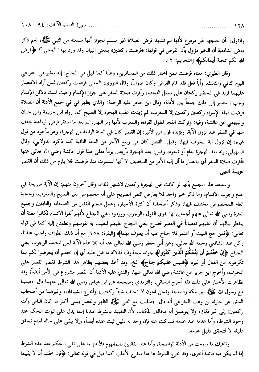 واستبعد هذا الجمع بأنها لو كانت قبل الهجرة ركعتين لاشتهر ذلك، وقال آخرون منهم: إن الآية صريحة في عدم وجوب الإتمام، وما ذكر خبر واحد فلا يعارض النص الصريح على أنه مخصوص بغير الصبح والمغرب، وحجية العام المخصوص مختلف فيها، وذكر أصحابنا أن كثرة الأخبار، وعمل الجم الغفير من الصحابة والتابعين وجميع العترة رضي الله تعالى عنهم أجمعين بها يقوي القول بالوجوب ووردوه بنفي الجناح لأنهم ألفوا الإتمام فكانوا مظنة أن يخطر ببالهم أن عليهم نقصانا في القصر فصرح بنفي الجناح عليهم لتطيب به نفوسهم وتطمئن إليه كما في قوله تعالى: فَمَنْ حَجَّ الْبَيْتَ أَوِ اعْتَمَرَ فَلا جُناحَ عَلَيْهِ أَنْ يَطَّوَّفَ بِهِما [البقرة: 158] مع أن ذلك الطواف واجب عندنا، ركن عند الشافعي رحمه الله تعالى، وعن أبي جعفر رضي الله تعالى عنه أنه تلا هذه الآية لمن استبعد الوجوب بنفي الجناح إِنْ خِفْتُمْ أَنْ يَفْتِنَكُمُ الَّذِينَ كَفَرُوا جوابه محذوف لدلالة ما قبل عليه أي إن خفتم أن يتعرضوا لكم بما تكرهونه من القتال أو غيره فَلَيْسَ عَلَيْكُمْ جُناحٌ إلخ، وقد أخذ بعضهم بظاهر هذا الشرط فقصر القصر على الخوف، وأخرج ابن جرير عن عائشة رضي الله تعالى عنها، والذي عليه الأئمة أن القصر مشروع في الأمن أيضا وقد تظاهرت الأخبار على ذلك