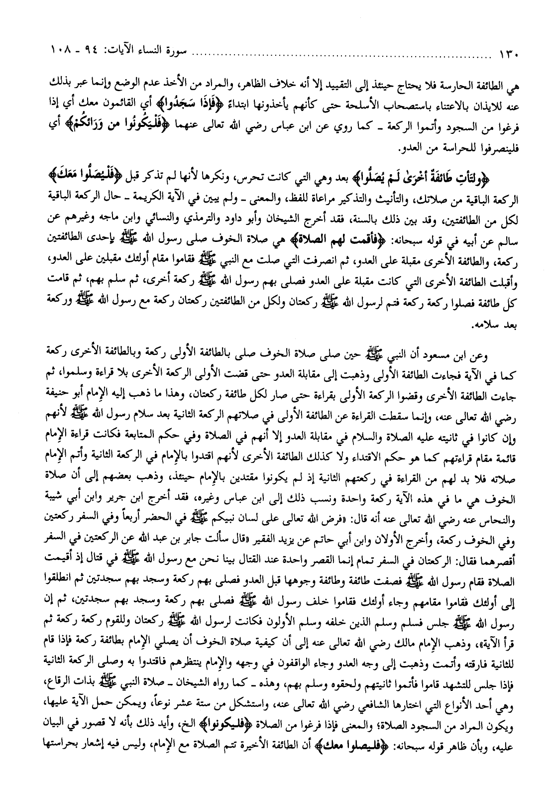 وعن ابن مسعود أن النبي صلّى الله عليه وسلّم حين صلى صلاة الخوف صلى بالطائفة الأولى ركعة وبالطائفة الأخرى ركعة كما في الآية فجاءت الطائفة الأولى وذهبت إلى مقابلة العدو حتى قضت الأولى الركعة الأخرى بلا قراءة وسلموا، ثم جاءت الطائفة الأخرى وقضوا الركعة الأولى بقراءة حتى صار لكل طائفة ركعتان،