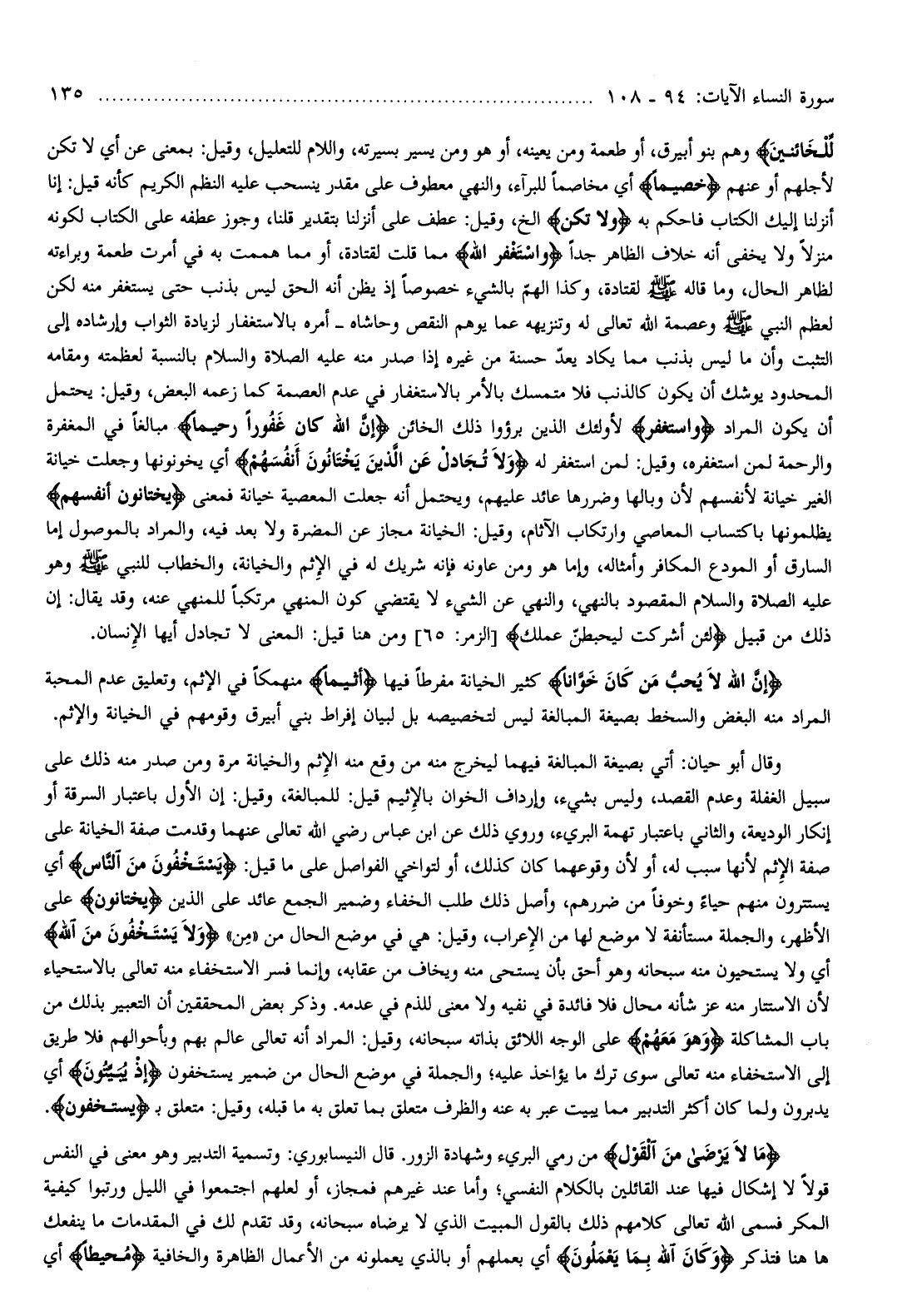 وهم بنو أبيرق، أو طعمة ومن يعينه، أو هو ومن يسير بسيرته، واللام للتعليل، وقيل: بمعنى عن أي لا تكن لأجلهم أو عنهم خَصِيماً أي مخاصما للبرآء، والنهي معطوف على مقدر ينسحب عليه النظم الكريم كأنه قيل: إنا أنزلنا إليك الكتاب فاحكم به وَلا تَكُنْ إلخ، وقيل: عطف على أنزلنا بتقدير قلنا، وجوز عطفه على الكتاب لكونه منزلا ولا يخفى أنه خلاف الظاهر جدا وَاسْتَغْفِرِ اللَّهَ مما قلت لقتادة، أو مما هممت به في أمرت طعمة وبراءته لظاهر الحال، وما قاله صلّى الله عليه وسلّم لقتادة، وكذا الهمّ بالشيء خصوصا إذ يظن أنه الحق ليس بذنب حتى يستغفر منه لكن لعظم النبي صلّى الله عليه وسلّم وعصمة الله تعالى له وتنزيهه عما يوهم النقص وحاشاه- أمره بالاستغفار لزيادة الثواب وإرشاده إلى التثبت وأن ما ليس بذنب مما يكاد يعدّ حسنة من غيره إذا صدر منه عليه الصلاة والسلام بالنسبة لعظمته ومقامه المحدود يوشك أن يكون كالذنب فلا متمسك بالأمر بالاستغفار في عدم العصمة كما زعمه البعض، وقيل: يحتمل أن يكون المراد وَاسْتَغْفِرِ لأولئك الذين برؤوا ذلك الخائن إِنَّ اللَّهَ كانَ غَفُوراً رَحِيماً مبالغا في المغفرة والرحمة لمن استغفره، وقيل: لمن استغفر له وَلا تُجادِلْ عَنِ الَّذِينَ يَخْتانُونَ أَنْفُسَهُمْ