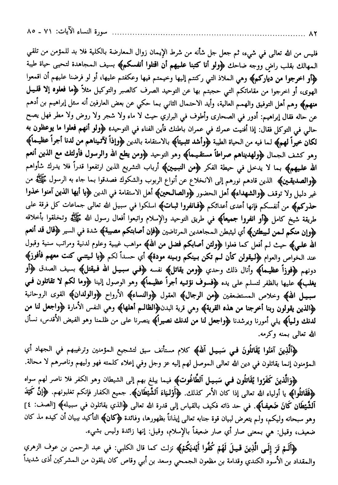 فليس من الله تعالى في شيء، ثم جعل جل شأنه من شرط الإيمان زوال المعارضة بالكلية فلا بد للمؤمن من تلقي المهالك بقلب راض ووجه ضاحك وَلَوْ أَنَّا كَتَبْنا عَلَيْهِمْ أَنِ اقْتُلُوا أَنْفُسَكُمْ بسيف المجاهدة لتحيى حياة طيبة أَوِ اخْرُجُوا مِنْ دِيارِكُمْ وهي الملاذ التي ركنتم إليها وخيمتم فيها وعكفتم عليها، أو لو فرضنا عليهم أن اقمعوا الهوى، أو اخرجوا من مقاماتكم التي حجبتم بها عن التوحيد الصرف كالصبر والتوكيل مثلا ما فَعَلُوهُ إِلَّا قَلِيلٌ مِنْهُمْ وهم أهل التوفيق والهمم العالية، وأيد الاحتمال الثاني بما حكي عن بعض العارفين أنه سئل إبراهيم بن أدهم عن حاله فقال إبراهيم: أدور في الصحارى وأطوف في البراري حيث لا ماء ولا شجر ولا روض ولا مطر فهل يصح حالي في التوكل فقال: إذا أفنيت عمرك في عمران باطنك فأين الفناء في التوحيد» وَلَوْ أَنَّهُمْ فَعَلُوا ما يُوعَظُونَ بِهِ لَكانَ خَيْراً لَهُمْ لما فيه من الحياة الطيبة وَأَشَدَّ تَثْبِيتاً بالاستقامة بالدين وَإِذاً لَآتَيْناهُمْ مِنْ لَدُنَّا أَجْراً عَظِيماً وهو كشف الجمال وَلَهَدَيْناهُمْ صِراطاً مُسْتَقِيماً وهو التوحيد وَمَنْ يُطِعِ اللَّهَ وَالرَّسُولَ فَأُولئِكَ مَعَ الَّذِينَ أَنْعَمَ اللَّهُ عَلَيْهِمْ بما لا يدخل في حيطة الفكر مِنَ النَّبِيِّينَ أرباب التشريع الذين ارتفعوا قدرا فلا يدرك شأواهم وَالصِّدِّيقِينَ الذين قادهم نورهم إلى الانخلاع عن أنواع الربوب والشكوك فصدقوا بما جاء به الرسول صلّى الله عليه وسلّم من غير دليل ولا توقف وَالشُّهَداءِ أهل الحضور وَالصَّالِحِينَ أهل الاستقامة في الدين يا أَيُّهَا الَّذِينَ آمَنُوا خُذُوا حِذْرَكُمْ من أنفسكم فإنها أعدى أعدائكم فَانْفِرُوا ثُباتٍ اسلكوا في سبيل الله تعالى جماعات كل فرقة على طريقة شيخ كامل أَوِ انْفِرُوا جَمِيعاً في طريق التوحيد والإسلام واتبعوا أفعال رسول الله صلّى الله عليه وسلّم وتخلقوا بأخلاقه وَإِنَّ مِنْكُمْ لَمَنْ لَيُبَطِّئَنَّ أي ليثبطن المجاهدين المرتاضين فَإِنْ أَصابَتْكُمْ مُصِيبَةٌ شدة في السير قالَ قَدْ أَنْعَمَ اللَّهُ عَلَيَّ حيث لم أفعل كما فعلوا وَلَئِنْ أَصابَكُمْ فَضْلٌ مِنَ اللَّهِ مواهب غيبية وعلوم لدنية ومراتب سنية وقبول عند الخواص والعوام لَيَقُولَنَّ كَأَنْ لَمْ تَكُنْ بَيْنَكُمْ وَبَيْنَهُ مَوَدَّةٌ أي حسدا لكم يا لَيْتَنِي كُنْتُ مَعَهُمْ فَأَفُوزَ دونهم فَوْزاً عَظِيماً وأنال ذلك وحدي وَمَنْ يُقاتِلْ نفسه فِي سَبِيلِ اللَّهِ فَيُقْتَلْ بسيف الصدق أَوْ يَغْلِبْ عليها بالظفر لتسلم على يده فَسَوْفَ نُؤْتِيهِ أَجْراً عَظِيماً وهو الوصول إلينا وَما لَكُمْ لا تُقاتِلُونَ فِي سَبِيلِ اللَّهِ وخلاص المستضعفين مِنَ الرِّجالِ العقول وَالنِّساءِ الأرواح وَالْوِلْدانِ القوى الروحانية الَّذِينَ يَقُولُونَ رَبَّنا أَخْرِجْنا مِنْ هذِهِ الْقَرْيَةِ وهي قرية البدن الظَّالِمِ أَهْلُها وهي النفس الأمارة وَاجْعَلْ لَنا مِنْ لَدُنْكَ وَلِيًّا يلي أمورنا ويرشدنا وَاجْعَلْ لَنا مِنْ لَدُنْكَ نَصِيراً ينصرنا على من ظلمنا وهو الفيض الأقدس، نسأل الله تعالى بمنه وكرمه.