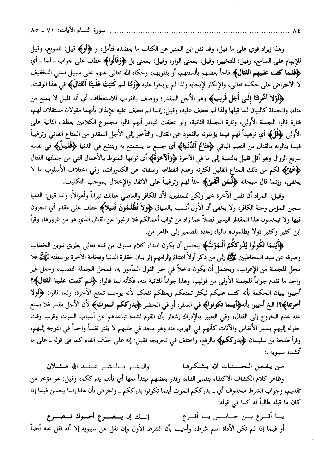 أجيبوا ببيان الحكمة بأنه كتب عليكم ليكثر تمتعكم ويعظكم نفعكم لأنه يوجب تمتع الآخرة، ولما قالوا: لَوْلا أَخَّرْتَنا؟! إلخ أجيبوا بأنه أَيْنَما تَكُونُوا في السفر، أو في الحضر يُدْرِكْكُمُ الْمَوْتُ لأن الأجل مقدر فلا يمنع عنه عدم الخروج إلى القتال، وفي التعبير بالإدراك إشعار بأن القوم لشدة تباعدهم عن أسباب الموت وقرب وقت حلوله إليهم بممر الأنفاس والآنات كأنهم في الهرب منه وهو مجد في طلبهم لا يفتر نفسا واحدا في التوجه إليهم، وقرأ طلحة بن سليمان يُدْرِكْكُمُ بالرفع، واختلف في تخريجه فقيل: إنه على حذف الفاء كما في قوله- على ما أنشده سيبويه.: