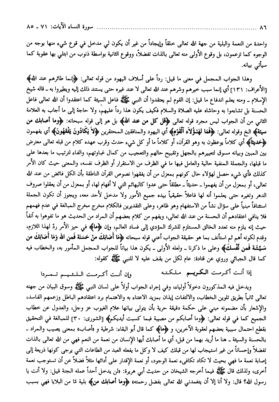 وهذا الجواب المجمل في معنى ما قيل: ردا على أسلاف اليهود من قوله تعالى: إِنَّما طائِرُهُمْ عِنْدَ اللَّهِ [الأعراف: 131] أي إنما سبب خيرهم وشرهم عند الله تعالى لا عند غيره حتى يستند ذلك إليه ويطيروا به- قاله شيخ الإسلام- ومنه يعلم اندفاع ما قيل: إن القوم لم يعتقدوا أن النبي صلّى الله عليه وسلّم فاعل السيئة كما اعتقدوا أن الله تعالى فاعل الحسنة بل تشاءموا به وحاشاه عليه الصلاة والسلام فكيف يكون هذا ردا عليهم، ولا حاجة إلى ما أجاب به العلامة الثاني من أن الجواب ليس مجرد قوله تعالى قُلْ كُلٌّ مِنْ عِنْدِ اللَّهِ بل هو إلى قوله سبحانه: وَما أَصابَكَ مِنْ سَيِّئَةٍ إلخ وقوله تعالى: فَمالِ هؤُلاءِ الْقَوْمِ أي اليهود والمنافقين المحتقرين لا يَكادُونَ يَفْقَهُونَ أي يفهمون حَدِيثاً أي كلاما يوعظون به وهو القرآن، أو كلاما ما أو كل شيء حدث وقرب عهده كلام من قبله تعالى معترض بين المبين وبيانه مسوق لتعييرهم بالجهل وتقبيح حالهم والتعجيب من كمال غباوتهم، والفاء لترتيب ما بعدها على ما قبلها، والجملة المنفية حالية والعامل فيها ما في الظرف من الاستقرار أو الظرف نفسه، والمعنى حيث كان الأمر كذلك فأي شيء حصل لهؤلاء حال كونهم بمعزل من أن يفقهوا نصوص القرآن الناطقة بأن الكل فائض من عند الله تعالى، أو بمعزل من أن يفهموا- حديثا- مطلقا حتى عدوا كالبهائم التي لا أفهام لها، أو بمعزل من أن يعقلوا صروف الدهر وتغيره حتى يعلموا أنه لها فاعلا حقيقيا بيده جميع الأمور ولا مدخل لأحد معه، ويجوز أن تكون الجملة استئنافا مبنيا على سؤال نشأ من الاستفهام وهو ظاهر، وعلى التقديرين فالكلام مخرج مخرج المبالغة في عدم فهمهم فلا ينافي اعتقادهم أن الحسنة من عند الله تعالى، ويفهم من كلام بعضهم أن المراد من الحديث هو ما تفوهوا به آنفا حيث إنه يلزم منه تعدد الخالق المستلزم للشرك المؤدي إلى فساد العالم، وإن ما في حيز الأمر ردّ لهذا اللازم، وقدم لكونه أهم ثم استأنف بما هو حقيقة الجواب أعني قوله سبحانه ما أَصابَكَ مِنْ حَسَنَةٍ فَمِنَ اللَّهِ وَما أَصابَكَ مِنْ سَيِّئَةٍ فَمِنْ نَفْسِكَ وعلى ما ذكرنا- ولعله الأولى- يكون هذا بيانا للجواب المجمل المأمور به، والخطاب فيه كما قال الجبائي وروي عن قتادة: عام لكل من يقف عليه لا للنبي صلّى الله عليه وسلّم كقوله: