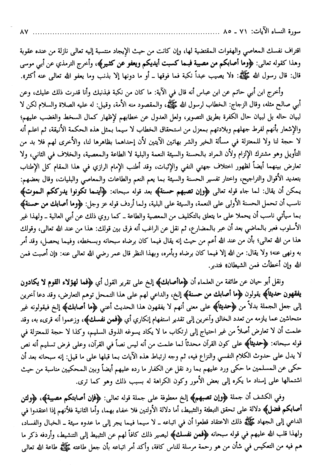 ونقل أبو حيان عن طائفة من العلماء أن ما أَصابَكَ إلخ على تقرير القول أي فَمالِ هؤُلاءِ الْقَوْمِ لا يَكادُونَ يَفْقَهُونَ حَدِيثاً يقولون ما أَصابَكَ مِنْ حَسَنَةٍ إلخ، والداعي لهم على هذا التمحل توهم التعارض، وقد دعا آخرين إلى جعل الجملة بدلا من حَدِيثاً على معنى أنهم لا يفقهون هذا الحديث أعني ما أَصابَكَ إلخ فيقولونه غير متحاشين عما يلزمه من تعدد الخالق وآخرين إلى تقدير استفهام إنكاري أي فَمِنْ نَفْسِكَ، وزعموا أنه قرىء به، وقد علمت أن لا تعارض أصلا من غير احتياج إلى ارتكاب ما لا يكاد يسوغه الذوق السليم، وكذا لا حجة للمعتزلة في قوله سبحانه: حَدِيثاً على كون القرآن محدثا لما علمت من أنه ليس نصا في القرآن، وعلى فرض تسليم أنه نص لا يدل على حدوث الكلام النفسي والنزاع فيه، ثم وجه ارتباط هذه الآيات بما قبلها على ما قيل: إنه سبحانه بعد أن حكى عن المسلمين ما حكى ورد عليهم بما رد نقل عن الكفار ما رده عليهم أيضا وبين المحكيين مناسبة من حيث اشتمالها على إسناد ما يكره إلى بعض الأمور وكون الكراهة له بسبب ذلك وهو كما ترى.