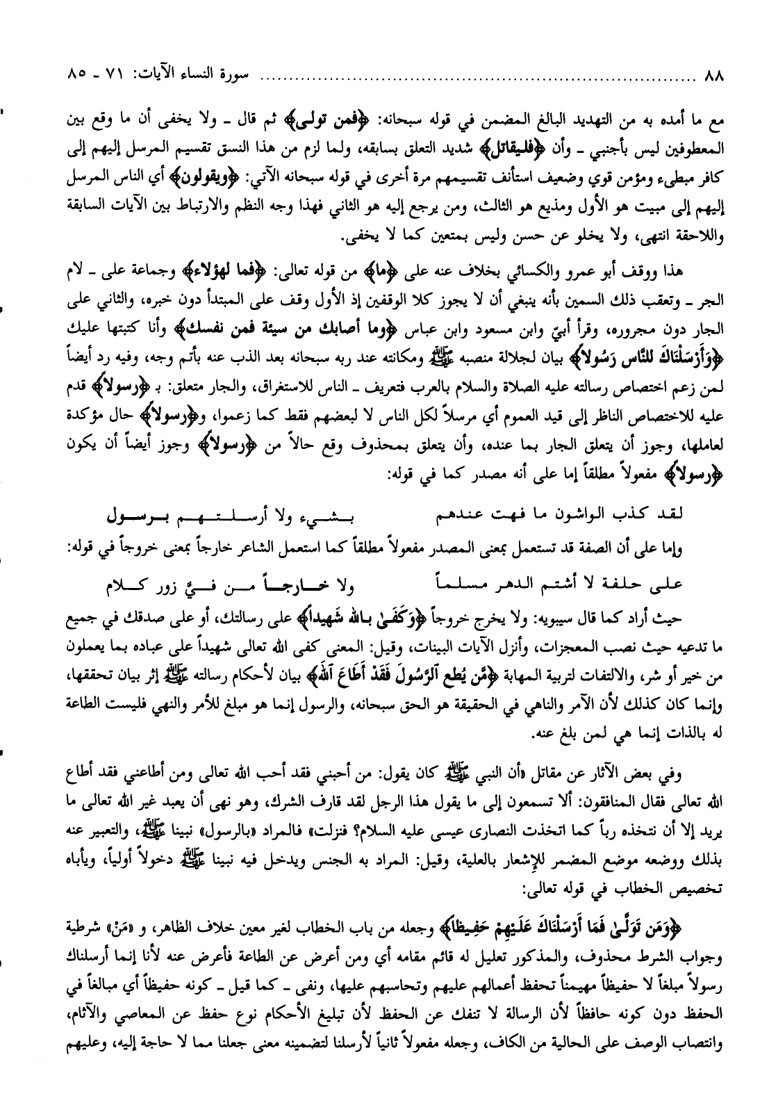 هذا ووقف أبو عمرو والكسائي بخلاف عنه على ما من قوله تعالى: فَمالِ هؤُلاءِ وجماعة على- لام الجر- وتعقب ذلك السمين بأنه ينبغي أن لا يجوز كلا الوقفين إذ الأول وقف على المبتدأ دون خبره، والثاني على الجار دون مجروره، وقرأ أبيّ وابن مسعود وابن عباس وَما أَصابَكَ مِنْ سَيِّئَةٍ فَمِنْ نَفْسِكَ وأنا كتبتها عليك وَأَرْسَلْناكَ لِلنَّاسِ رَسُولًا بيان لجلالة منصبه صلّى الله عليه وسلّم ومكانته عند ربه سبحانه بعد الذب عنه بأتم وجه، وفيه رد أيضا لمن زعم اختصاص رسالته عليه الصلاة والسلام بالعرب فتعريف- الناس للاستغراق، والجار متعلق: ب رَسُولًا قدم عليه للاختصاص الناظر إلى قيد العموم أي مرسلا لكل الناس لا لبعضهم فقط كما زعموا، ورَسُولًا حال مؤكدة لعاملها، وجوز أن يتعلق الجار بما عنده، وأن يتعلق بمحذوف وقع حالا من رَسُولًا وجوز أيضا أن يكون رَسُولًا مفعولا مطلقا إما على أنه مصدر كما في قوله: