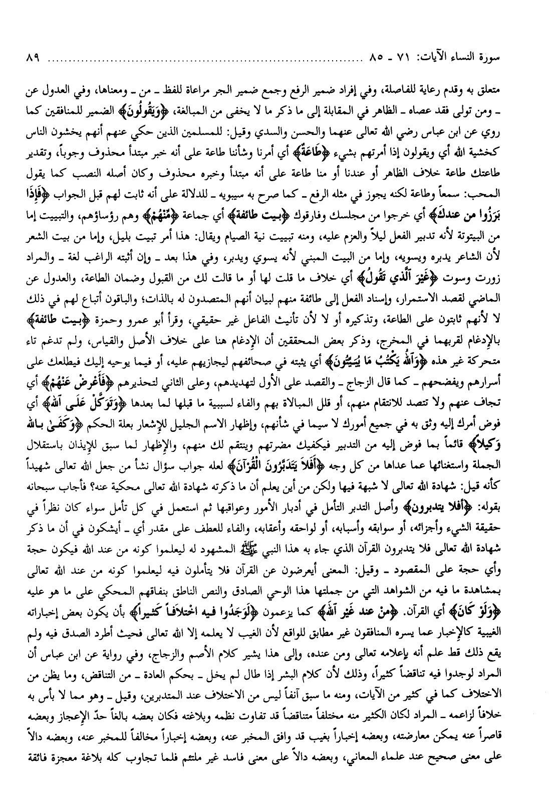 متعلق به وقدم رعاية للفاصلة، وفي إفراد ضمير الرفع وجمع ضمير الجر مراعاة للفظ- من- ومعناها، وفي العدول عن- ومن تولى فقد عصاه- الظاهر في المقابلة إلى ما ذكر ما لا يخفى من المبالغة، وَيَقُولُونَ الضمير للمنافقين كما روي عن ابن عباس رضي الله تعالى عنهما والحسن والسدي وقيل: للمسلمين الذين حكي عنهم أنهم يخشون الناس كخشية الله أي ويقولون إذا أمرتهم بشيء طاعَةٌ أي أمرنا وشأننا طاعة على أنه خبر مبتدأ محذوف وجوبا، وتقدير طاعتك طاعة خلاف الظاهر أو عندنا أو منا طاعة على أنه مبتدأ وخبره محذوف وكان أصله النصب كما يقول المحب: سمعا وطاعة لكنه يجوز في مثله الرفع- كما صرح به سيبويه- للدلالة على أنه ثابت لهم قبل الجواب فَإِذا بَرَزُوا مِنْ عِنْدِكَ أي خرجوا من مجلسك وفارقوك بَيَّتَ طائِفَةٌ أي جماعة مِنْهُمْ وهم رؤساؤهم، والتبييت إما من البيتوتة لأنه تدبير الفعل ليلا والعزم عليه، ومنه تبييت نية الصيام ويقال: هذا أمر تبيت بليل، وإما من بيت الشعر لأن الشاعر يدبره ويسويه، وإما من البيت المبني لأنه يسوي ويدبر، وفي هذا بعد- وإن أثبته الراغب لغة- والمراد زورت وسوت غَيْرَ الَّذِي تَقُولُ أي خلاف ما قلت لها أو ما قالت لك من القبول وضمان الطاعة، والعدول عن الماضي لقصد الاستمرار، وإسناد الفعل إلى طائفة منهم لبيان أنهم المتصدون له بالذات والباقون أتباع لهم في ذلك لا لأنهم ثابتون على الطاعة، وتذكيره أو لا لأن تأنيث الفاعل غير حقيقي، وقرأ أبو عمرو وحمزة بَيَّتَ طائِفَةٌ بالإدغام لقربهما في المخرج، وذكر بعض المحققين أن الإدغام هنا على خلاف الأصل والقياس، ولم تدغم تاء متحركة غير هذه وَاللَّهُ يَكْتُبُ ما يُبَيِّتُونَ أي يثبته في صحائفهم ليجازيهم عليه، أو فيما يوحيه إليك فيطلعك على أسرارهم ويفضحهم- كما قال الزجاج- والقصد على الأول لتهديدهم، وعلى الثاني لتحذيرهم فَأَعْرِضْ عَنْهُمْ أي تجاف عنهم ولا تتصد للانتقام منهم، أو قلل المبالاة بهم والفاء لسببية ما قبلها لما بعدها وَتَوَكَّلْ عَلَى اللَّهِ أي فوض أمرك إليه وثق به في جميع أمورك لا سيما في شأنهم، وإظهار الاسم الجليل للإشعار بعلة الحكم وَكَفى بِاللَّهِ وَكِيلًا قائما بما فوض إليه من التدبير فيكفيك مضرتهم وينتقم لك منهم، والإظهار لما سبق للإيذان باستقلال الجملة واستغنائها عما عداها من كل وجه أَفَلا يَتَدَبَّرُونَ الْقُرْآنَ لعله جواب سؤال نشأ من جعل الله تعالى شهيدا كأنه قيل: شهادة الله تعالى لا شبهة فيها ولكن من أين يعلم أن ما ذكرته شهادة الله تعالى محكية عنه؟ فأجاب سبحانه بقوله: أَفَلا يَتَدَبَّرُونَ وأصل التدبر التأمل في أدبار الأمور وعواقبها ثم استعمل في كل تأمل سواء كان نظرا في حقيقة الشيء وأجزائه، أو سوابقه وأسبابه، أو لواحقه وأعقابه، والفاء للعطف على مقدر أي- أيشكون في أن ما ذكر شهادة الله تعالى فلا يتدبرون القرآن الذي جاء به هذا النبي صلّى الله عليه وسلّم المشهود له ليعلموا كونه من عند الله فيكون حجة وأي حجة على المقصود- وقيل: المعنى أيعرضون عن القرآن فلا يتأملون فيه ليعلموا كونه من عند الله تعالى بمشاهدة ما فيه من الشواهد التي من جملتها هذا الوحي الصادق والنص الناطق بنفاقهم المحكي على ما هو عليه وَلَوْ كانَ أي القرآن. مِنْ عِنْدِ غَيْرِ اللَّهِ كما يزعمون لَوَجَدُوا فِيهِ اخْتِلافاً كَثِيراً بأن يكون بعض إخباراته الغيبية كالإخبار عما يسره المنافقون غير مطابق للواقع لأن الغيب لا يعلمه إلا الله تعالى فحيث أطرد الصدق فيه ولم يقع ذلك قط علم أنه بإعلامه تعالى ومن عنده، وإلى هذا يشير كلام الأصم