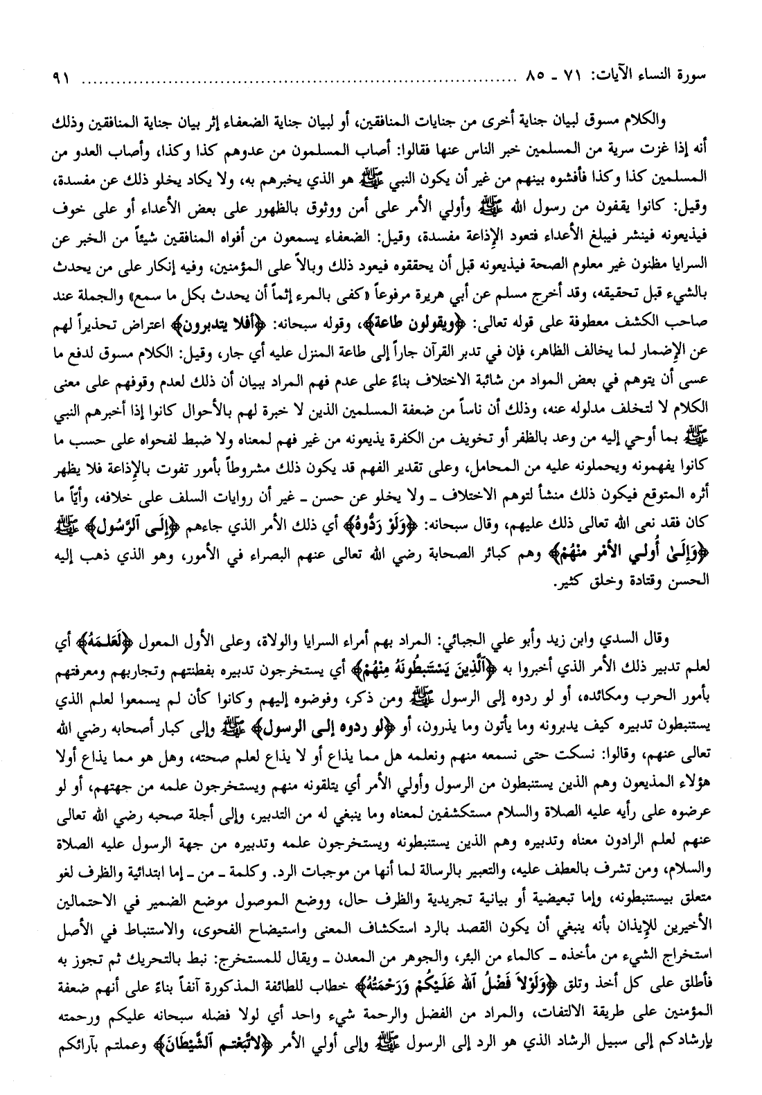 وقال السدي وابن زيد وأبو علي الجبائي: المراد بهم أمراء السرايا والولاة، وعلى الأول المعول لَعَلِمَهُ أي لعلم تدبير ذلك الأمر الذي أخبروا به الَّذِينَ يَسْتَنْبِطُونَهُ مِنْهُمْ أي يستخرجون تدبيره بفطنتهم وتجاربهم ومعرفتهم بأمور الحرب ومكائده، أو لو ردوه إلى الرسول صلّى الله عليه وسلّم ومن ذكر، وفوضوه إليهم وكانوا كأن لم يسمعوا لعلم الذي يستنبطون تدبيره كيف يدبرونه وما يأتون وما يذرون، أو لَوْ رَدُّوهُ إِلَى الرَّسُولِ صلّى الله عليه وسلّم وإلى كبار أصحابه رضي الله تعالى عنهم، وقالوا: نسكت حتى نسمعه منهم ونعلمه هل مما يذاع أو لا يذاع لعلم صحته، وهل هو مما يذاع أو لا هؤلاء المذيعون وهم الذين يستنبطون من الرسول وأولي الأمر أي يتلقونه منهم ويستخرجون علمه من جهتهم، أو لو عرضوه على رأيه عليه الصلاة والسلام مستكشفين لمعناه وما ينبغي له من التدبير، وإلى أجلة صحبه رضي الله تعالى عنهم لعلم الرادون معناه وتدبيره وهم الذين يستنبطونه ويستخرجون علمه وتدبيره من جهة الرسول عليه الصلاة والسلام، ومن تشرف بالعطف عليه، والتعبير بالرسالة لما أنها من موجبات الرد. وكلمة- من- إما ابتدائية والظرف لغو متعلق بيستنبطونه، وإما تبعيضية أو بيانية تجريدية والظرف حال، ووضع الموصول موضع الضمير في الاحتمالين الأخيرين للإيذان بأنه ينبغي أن يكون القصد بالرد استكشاف المعنى واستيضاح الفحوى، والاستنباط في الأصل استخراج الشيء من مأخذه- كالماء من البئر، والجوهر من المعدن- ويقال للمستخرج: نبط بالتحريك ثم تجوز به فأطلق على كل أخذ وتلق وَلَوْلا فَضْلُ اللَّهِ عَلَيْكُمْ وَرَحْمَتُهُ خطاب للطائفة المذكورة آنفا بناء على أنهم ضعفة المؤمنين على طريقة الالتفات، والمراد من الفضل والرحمة شيء واحد أي لولا فضله سبحانه عليكم ورحمته بإرشادكم إلى سبيل الرشاد الذي هو الرد إلى الرسول صلّى الله عليه وسلّم وإلى أولي الأمر لَاتَّبَعْتُمُ الشَّيْطانَ وعملتم بآرائكم