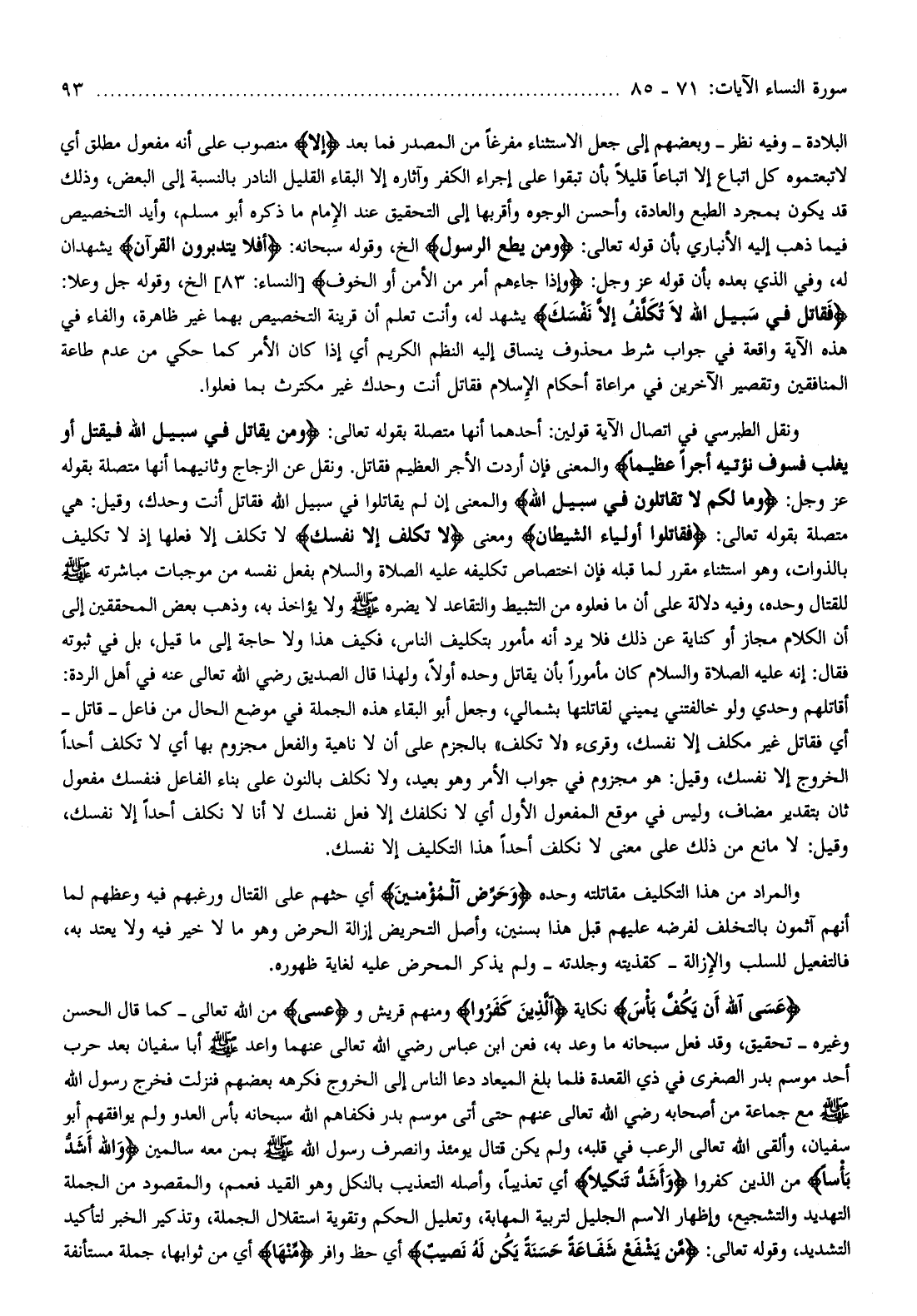 والمراد من هذا التكليف مقاتلته وحده وَحَرِّضِ الْمُؤْمِنِينَ أي حثهم على القتال ورغبهم فيه وعظهم لما أنهم آثمون بالتخلف لفرضه عليهم قبل هذا بسنين، وأصل التحريض إزالة الحرض وهو ما لا خير فيه ولا يعتد به، فالتفعيل للسلب والإزالة- كقذيته وجلدته- ولم يذكر المحرض عليه لغاية ظهوره.