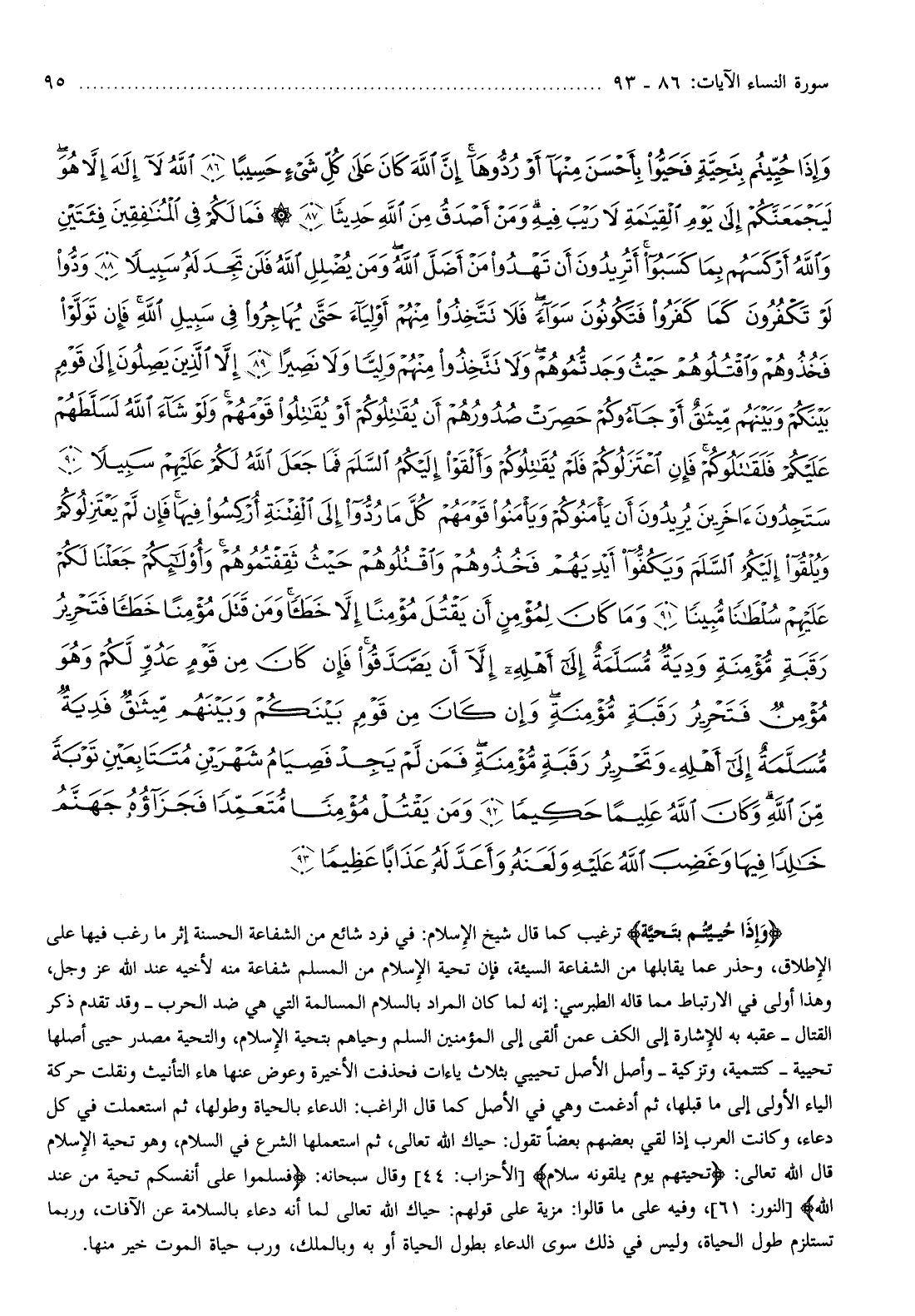 وَإِذا حُيِّيتُمْ بِتَحِيَّةٍ ترغيب كما قال شيخ الإسلام: في فرد شائع من الشفاعة الحسنة إثر ما رغب فيها على الإطلاق، وحذر عما يقابلها من الشفاعة السيئة، فإن تحية الإسلام من المسلم شفاعة منه لأخيه عند الله عز وجل، وهذا أولى في الارتباط مما قاله الطبرسي: إنه لما كان المراد بالسلام المسالمة التي هي ضد الحرب- وقد تقدم ذكر القتال- عقبه به للإشارة إلى الكف عمن ألقى إلى المؤمنين السلم وحياهم بتحية الإسلام، والتحية مصدر حيى أصلها تحيية- كتتمية، وتزكية- وأصل الأصل تحييي بثلاث ياءات فحذفت الأخيرة وعوض عنها هاء التأنيث ونقلت حركة الياء الأولى إلى ما قبلها، ثم أدغمت وهي في الأصل كما قال الراغب: الدعاء بالحياة وطولها، ثم استعملت في كل دعاء، وكانت العرب إذا لقي بعضهم بعضا تقول: حياك الله تعالى، ثم استعملها الشرع في السلام، وهو تحية الإسلام قال الله تعالى: تَحِيَّتُهُمْ يَوْمَ يَلْقَوْنَهُ سَلامٌ [الأحزاب: 44] وقال سبحانه: فَسَلِّمُوا عَلى أَنْفُسِكُمْ تَحِيَّةً مِنْ عِنْدِ اللَّهِ [النور: 61] ، وفيه على ما قالوا: مزية على قولهم: حياك الله تعالى لما أنه دعاء بالسلامة عن الآفات، وربما تستلزم طول الحياة، وليس في ذلك سوى الدعاء بطول الحياة أو به وبالملك، ورب حياة الموت خير منها.