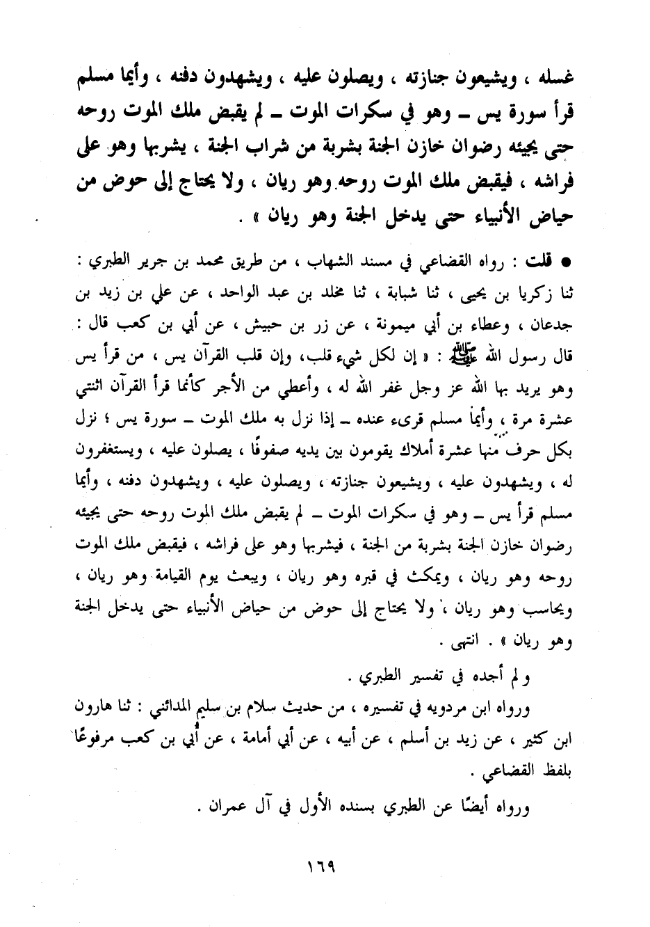 قلت رَوَاهُ الْقُضَاعِي فِي مُسْند الشهَاب من طَرِيق مُحَمَّد بن جرير الطَّبَرِيّ ثَنَا زَكَرِيَّا بن يَحْيَى ثَنَا شَبابَة ثَنَا مخلد بن عبد الْوَاحِد عَن عَلّي بنى زيد بن جدعَان وَعَطَاء بن أبي مَيْمُونَة عَن زر حُبَيْش عَن أبي بن كَعْب قَالَ قَالَ رَسُول الله صَلَّى اللَّهُ عَلَيْهِ وَسَلَّم َ (إِن لكل شَيْء قلب وَإِن قلب الْقُرْآن يس من قَرَأَ يس وَهُوَ يُرِيد بهَا الله عَزَّ وَجَلَّ غفر الله لَهُ وَأعْطِي من الْأجر كَأَنَّمَا قَرَأَ الْقُرْآن اثْنَتَيْ عشر مرّة وَأَيّمَا مُسلم قرئَ عِنْده إِذا نزل بِهِ ملك الْمَوْت سُورَة يس نزل بِكُل حرف مِنْهَا عشرَة أَمْلَاك يقومُونَ بَين يَدَيْهِ صُفُوفا يصلونَ عَلَيْهِ وَيَسْتَغْفِرُونَ لَهُ وَيشْهدُونَ عَلَيْهِ ويشيعون جنَازَته وَيصلونَ عَلَيْهِ وَيشْهدُونَ دَفنه وَأَيّمَا مُسلم قَرَأَ يس وَهُوَ فِي سَكَرَات الْمَوْت لم يقبض ملك الْمَوْت روحه حَتَّى يَجِيئهُ رضوَان خَازِن الْجنَّة بِشَربَة من الْجنَّة فَيَشْرَبهَا وَهُوَ عَلَى فرَاشه فَيقبض ملك الْمَوْت روحه وَهُوَ رَيَّان وَيمْكث فِي قَبره وَهُوَ رَيَّان وَيبْعَث يَوْم الْقِيَامَة وَهُوَ رَيَّان وَيُحَاسب وَهُوَ رَيَّان وَلَا يحْتَاج إِلَى حَوْض من حِيَاض الْأَنْبِيَاء حَتَّى يدْخل الْجنَّة وَهُوَ رَيَّان) انْتَهَى