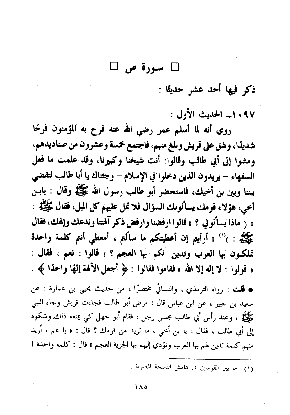 رُوِيَ أَنه لما أسلم عمر رَضِيَ اللَّهُ عَنْه فَرح بِهِ الْمُؤْمِنُونَ فَرحا شَدِيدا وشق عَلَى قُرَيْش وَبلغ مِنْهُم فَاجْتمع خَمْسَة وَعِشْرُونَ من صَنَادِيدهمْ وَمَشوا إِلَى أبي طَالب وَقَالُوا أَنْت شَيخنَا وَكَبِيرنَا وَقد علمت مَا فعل السُّفَهَاء يُرِيدُونَ الَّذين دخلُوا فِي الْإِسْلَام وَجِئْنَاك يَا أَبَا طَالب لِتَقضي بَيْننَا وَبَين بن أَخِيك فَاسْتَحْضر أَبُو طَالب رَسُول الله صَلَّى اللَّهُ عَلَيْهِ وَسَلَّم َ وَقَالَ يَا ابْن أخي هَؤُلَاءِ قَوْمك يَسْأَلُونَك السُّؤَال فَلَا تمل عَلَيْهِم كل الْميل فَقَالَ صَلَّى اللَّهُ عَلَيْهِ وَسَلَّم َ (مَاذَا يَسْأَلُونِي) قَالُوا اُرْفُضْنَا وَارْفض ذكر آلِهَتنَا وَإِلَهك وَنَدَعك وَإِلَهك فَقَالَ صَلَّى اللَّهُ عَلَيْهِ وَسَلَّم َ (أَرَأَيْتُم إِن أَعطيتكُم مَا سَأَلْتُم أمعطي أَنْتُم كلمة وَاحِدَة تَمْلِكُونَ بهَا الْعَرَب وَتَدين لكم بهَا الْعَجم) قَالُوا نعم فَقَالَ (قُولُوا لَا إِلَه إِلَّا الله) فَقَامُوا فَقَالُوا أجعَل الْآلهَة إِلَهًا وَاحِدًا