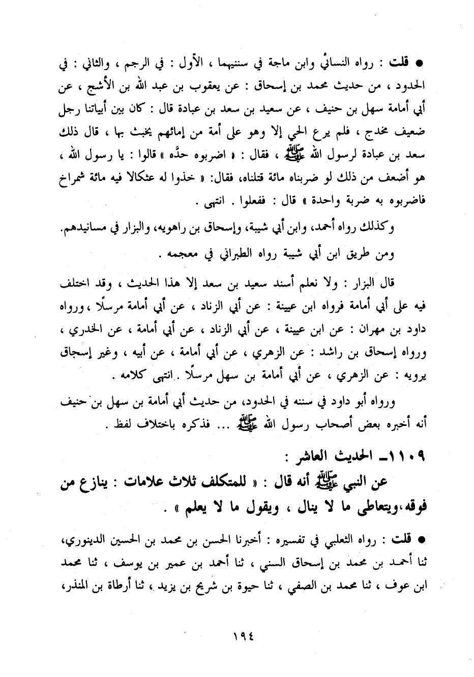 قلت رَوَاهُ النَّسَائِيّ وَابْن ماجة فِي سنَنَيْهِمَا الأول فِي الرَّجْم وَالثَّانِي فِي الْحُدُود من حَدِيث مُحَمَّد بن إِسْحَاق عَن يَعْقُوب بن عبد الله بن الْأَشَج عَن أبي أُمَامَة سهل بن حنيف عَن سعيد بن سعد بن عبَادَة قَالَ كَانَ بَين أَبْيَاتنَا رجل ضَعِيف مُخْدج فَلم يرع الْحَيّ إِلَّا وَهُوَ عَلَى أمة من إمَائِهِمْ يخْبث بهَا قَالَ ذَلِك سعد بن عبَادَة لرَسُول الله صَلَّى اللَّهُ عَلَيْهِ وَسَلَّم َ فَقَالَ (اضْرِبُوهُ حَده) قَالُوا يَا رَسُول الله هُوَ أَضْعَف من ذَلِك لَو ضَرَبْنَاهُ مائَة قَتَلْنَاهُ فَقَالَ (خُذُوا لَهُ عثْكَالًا فِيهِ مائَة شِمْرَاخ فَاضْرِبُوهُ بِهِ ضَرْبَة وَاحِدَة) قَالَ فَفَعَلُوا انْتَهَى