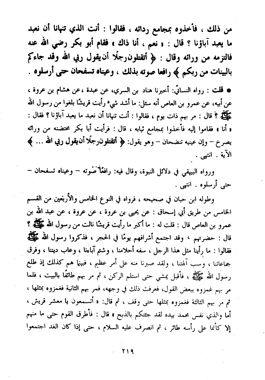 قلت رَوَاهُ النَّسَائِيّ أخبرنَا هناد بن السّري عَن عَبدة عَن هِشَام بن عُرْوَة عَن أَبِيه عَن عَمْرو بن الْعَاصِ أَنه سُئِلَ مَا أَشد شَيْء رَأَيْت قُريْشًا بلغُوا من رَسُول الله صَلَّى اللَّهُ عَلَيْهِ وَسَلَّم َ قَالَ مر بهم ذَات يَوْم فَقَالُوا أَنْت تَنْهَانَا أَن نعْبد مَا يعبد آبَاؤُنَا فَقَالَ (أَنا) فَقَامُوا إِلَيْهِ فَأخذُوا بِمَجَامِع ثِيَابه قَالَ فَرَأَيْت أَبَا بكر محتضنة من رُوَائِهِ يصْرخ وَإِن عَيْنَيْهِ تَنْضَحَانِ وَهُوَ يَقُول أَتقْتلونَ رجلا أَن يَقُول رَبِّي الله الْآيَة انْتَهَى