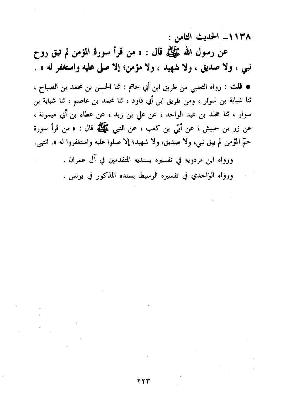 قلت رَوَاهُ الثَّعْلَبِيّ من طَرِيق ابْن أبي حَاتِم ثَنَا الْحسن بن مُحَمَّد بن الصَّباح ثَنَا شَبابَة بن سوار وَمن طَرِيق ابْن أبي دَاوُد ثَنَا مُحَمَّد بن عَاصِم ثَنَا شَبابَة بن سوار ثَنَا مخلد بن عبد الْوَاحِد عَن عَلّي بن زيد عَن عَطاء بن أبي مَيْمُونَة عَن زر بن حُبَيْش عَن أبي بن كَعْب عَن النَّبِي صَلَّى اللَّهُ عَلَيْهِ وَسَلَّم َ قَالَ (من قَرَأَ سُورَة حم الْمُؤمن لم يبْق نَبِي وَلَا صديق وَلَا شَهِيد وَإِلَّا صلوا عَلَيْهِ وَاسْتَغْفرُوا لَهُ) انْتَهَى