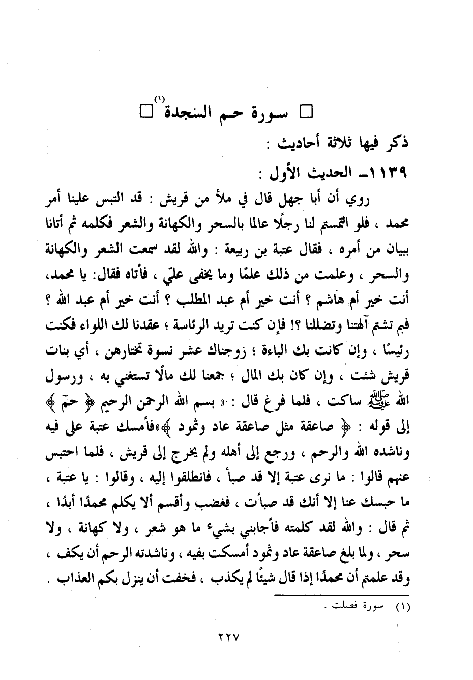 رُوِيَ أَن أَبَا جهل قَالَ فِي مَلأ من قُرَيْش قد الْتبس علينا أَمر مُحَمَّد فَلَو الْتَمَسْتُمْ لنا رجلا عَالما بِالسحرِ وَالْكهَانَة وَالشعر فَكَلمهُ ثمَّ أَتَانَا بِبَيَان من أمره فَقَالَ عتبَة بن ربيعَة وَالله لقد سَمِعت الشّعْر وَالْكهَانَة وَالسحر وَعلمت من ذَلِك علما وَمَا يخْفَى عَلّي فَأَتَاهُ فَقَالَ يَا مُحَمَّد أَنْت خير أم هَاشم أَنْت خير أم عبد الْمطلب أَنْت خير أم عبد الله فَبِمَ تَشْتُم آلِهَتنَا وتظللنا فَإِن كنت تُرِيدُ الرِّئَاسَة عَقدنَا لَك اللِّوَاء فَكنت رَئِيسا وَإِن كَانَت بك الْبَاءَة زَوَّجْنَاك عشرَة نسْوَة تختارهن أَي بَنَات قُرَيْش شِئْت وَإِن كَانَ بك المَال جَمعنَا لَك مَالا تَسْتَغْنِي بِهِ وَرَسُول الله صَلَّى اللَّهُ عَلَيْهِ وَسَلَّم َ سَاكِت فَلَمَّا فرغ قَالَ (بِسم الله الرَّحْمَن الرَّحِيم حم إِلَى قَوْله صَاعِقَة مثل صَاعِقَة عَاد وَثَمُود فَأمْسك عتبَة عَلَى فَمه وَنَاشَدَهُ الله وَالرحم وَرجع إِلَى أَهله وَلم يخرج إِلَى قُرَيْش فَلَمَّا احْتبسَ عَنْهُم قَالُوا مَا نرَى عتبَة إِلَّا قد صَبأ فَانْطَلقُوا إِلَيْهِ وَقَالُوا يَا عتبَة مَا حَبسك عَنَّا إِلَّا أَنَّك قد صَبَأت فَغَضب وَأقسم أَلا يكلم مُحَمَّدًا أبدا ثمَّ قَالَ وَالله لقد كَلمته فَأَجَابَنِي بِشَيْء مَا هُوَ شعر وَلَا كُهَّانه وَلَا سحر وَلما بلغ صَاعِقَة عَاد وَثَمُود أَمْسَكت بِفِيهِ وَنَاشَدْته الرَّحِم أَن يكف وَقد علمْتُم أَن مُحَمَّدًا إِذا قَالَ شَيْئا لم يكذب فَخفت أَن ينزل بكم الْعَذَاب