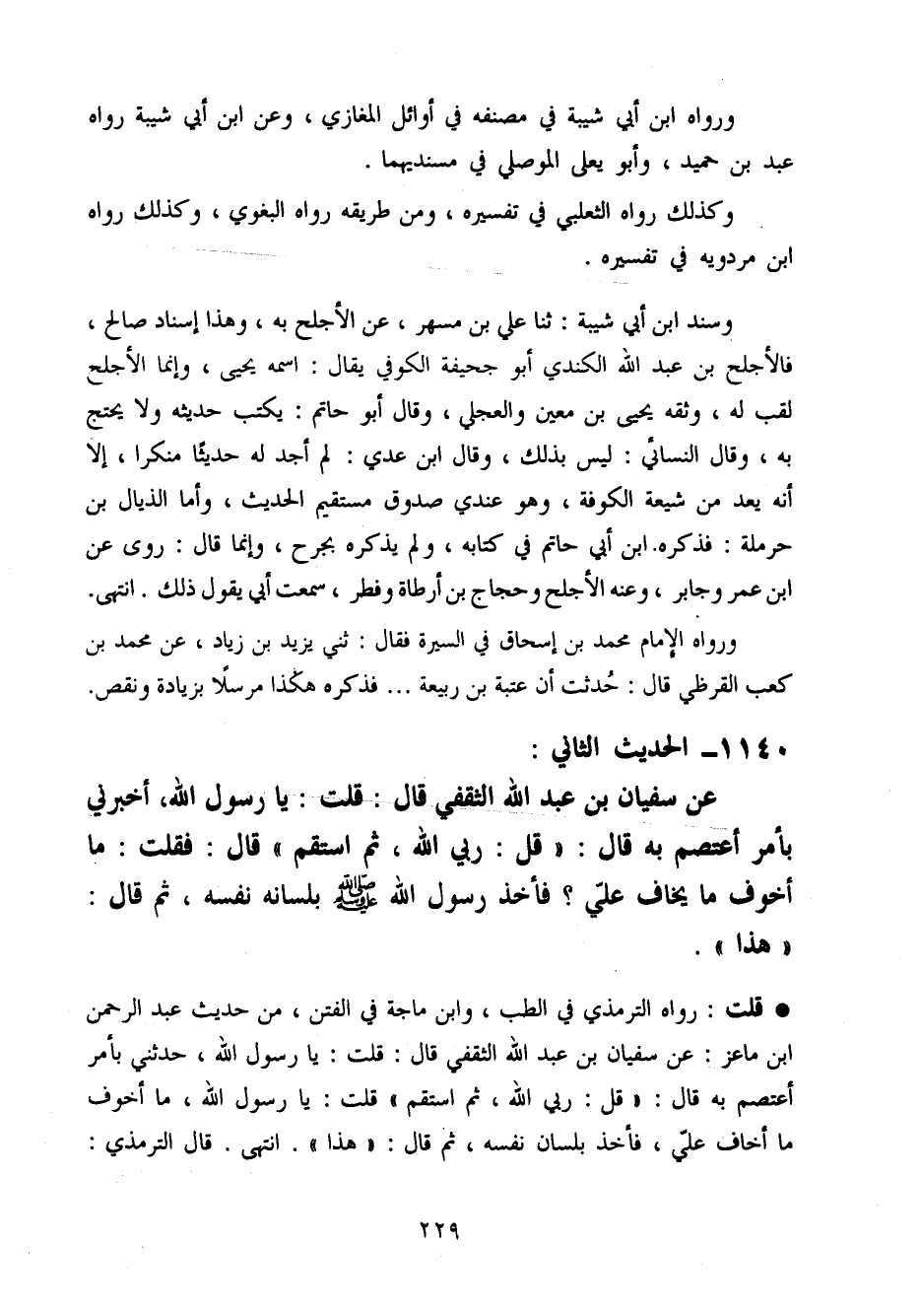 قلت رَوَاهُ التِّرْمِذِيّ فِي الطِّبّ وَابْن ماجة فِي الْفِتَن من حَدِيث عبد الرَّحْمَن ابْن مَاعِز عَن سُفْيَان بن عبد الله الثَّقَفِيّ قَالَ قلت يَا رَسُول الله حَدثنِي بِأَمْر أَعْتَصِم بِهِ قَالَ (قل رَبِّي الله ثمَّ اسْتَقِم) قلت يَا رَسُول الله مَا أخوف مَا أَخَاف عَلّي فاخذ بِلِسَان نَفسه ثمَّ قَالَ (هَذَا) انْتَهَى قَالَ التِّرْمِذِيّ