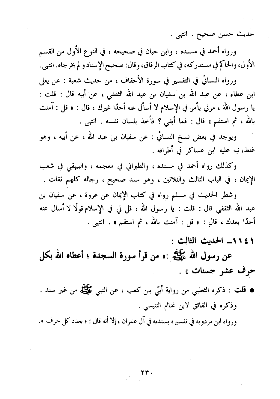 وَرَوَاهُ النَّسَائِيّ فِي التَّفْسِير فِي سُورَة الْأَحْقَاف من حَدِيث شُعْبَة عَن يعلي ابْن عَطاء عَن عبد الله بن سُفْيَان بن عبد الله الثَّقَفِيّ عَن أَبِيه قَالَ قلت يَا رَسُول الله مرني بِأَمْر فِي الْإِسْلَام لَا أسَال عَنهُ أحدا غَيْرك قَالَ (قل آمَنت بِاللَّه ثمَّ اسْتَقِم) قَالَ فَنًّا أَبْقَى فَأخذ بِلِسَان نَفسه انْتَهَى